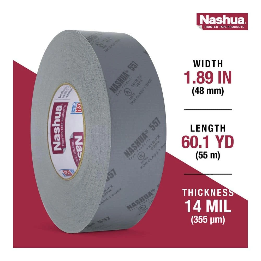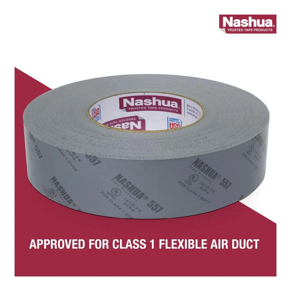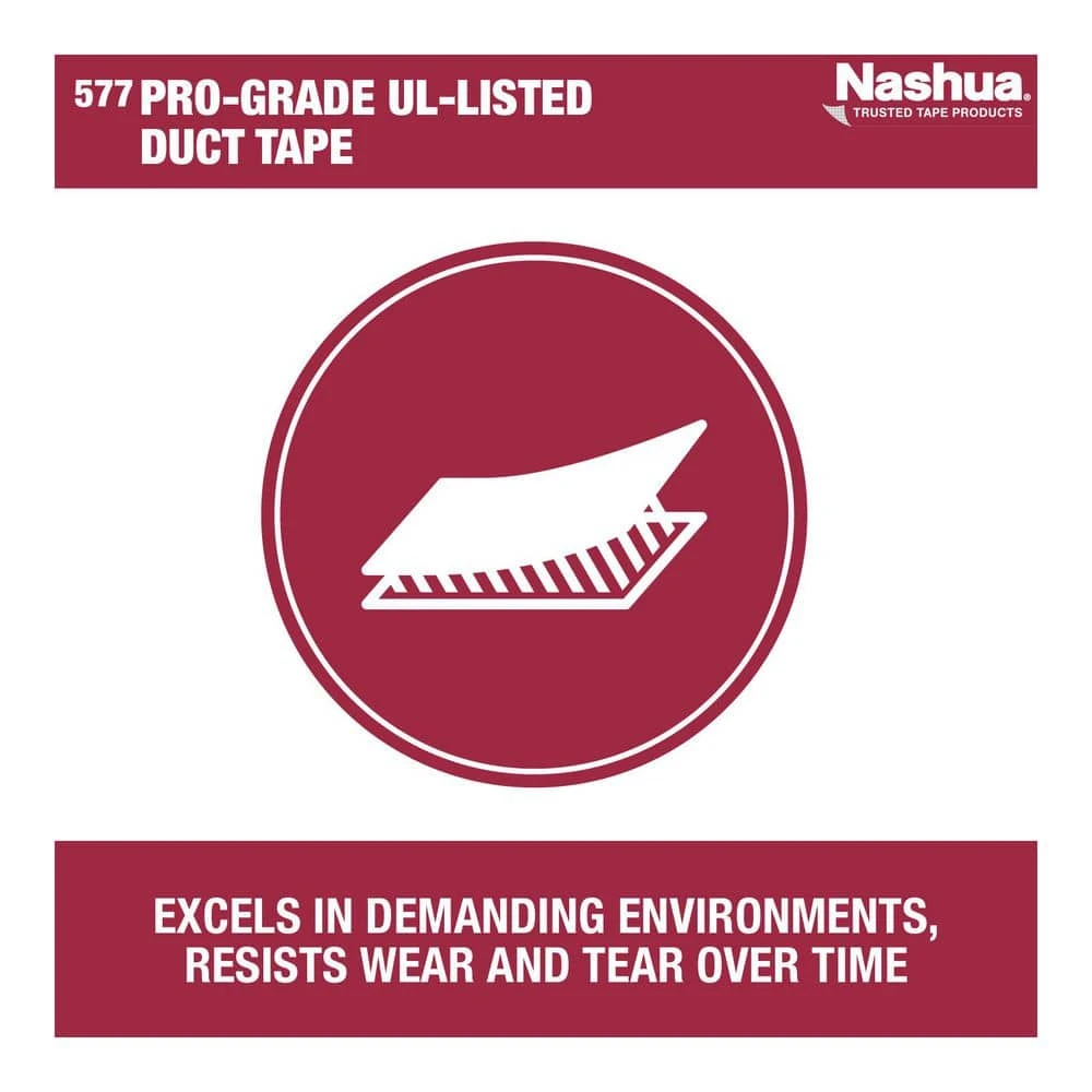 Professional results that a DIYer can be proud of begins with 557 Pro-Grade UL Listed Duct Tape by Nashua. This UL Listed tape is UL code approved for sealing class 1 flexible (181B-FX) duct joints and connections. With a polyethylene-coated cloth backing printed for easy inspection and a durable rubber adhesive, Nashua 557 is the ideal choice for sealing flexible duct work, dryer vents, and for heavy-duty household repairs. Nashua Tape. Trusted by professionals. DIY approved. Count on Nashua to get the job done right.