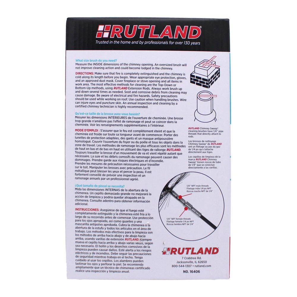 RUTLAND Chimney Sweep Round Wire Cleaning Brush is designed with the DIY homeowner in mind, can withstand vigorous cleaning, and helps keep chimneys and homes safe. Made with sturdy, oil-tempered spring wire, this brush will last for a long time and make quick work of any chimney cleaning project. Cleans out soot, creosote, and any other buildup in masonry chimneys to increase efficiency and safety. For best results, choose the brush size that matches the inside chimney flue measurements. (Use a poly brush for chimneys with metal liners.) This brush has a male 1/4? NPT threaded connector for attaching to rods and pull rings.