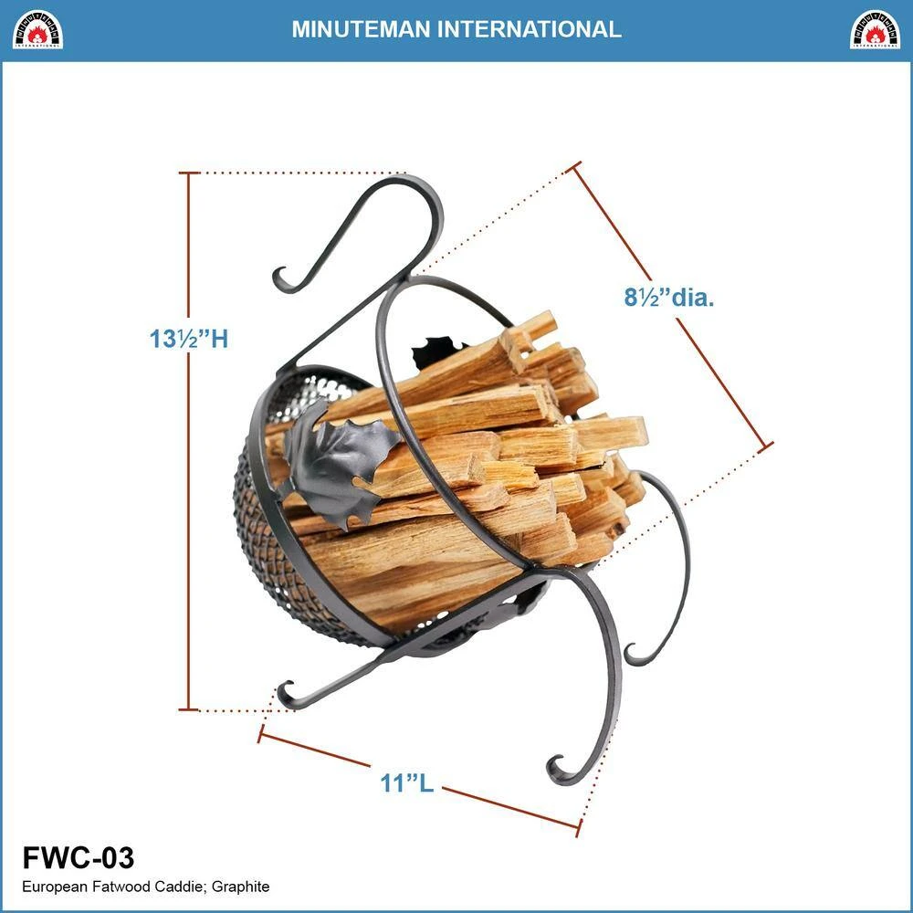 Fatwood fire starting sticks are a safe and natural alternative to chemical starters. The angled basket of the European Fatwood Caddy, adorned with a beautiful maple leaf on each side, will keep your kindling handy. 4 lbs. of fatwood are included in this neat Firestarter package. Complete your traditional hearth decor with any of our MINUTEMAN INTERNATIONAL wrought iron Tool Sets and Fireplace Screens for a traditional hand-forged fireplace decor.