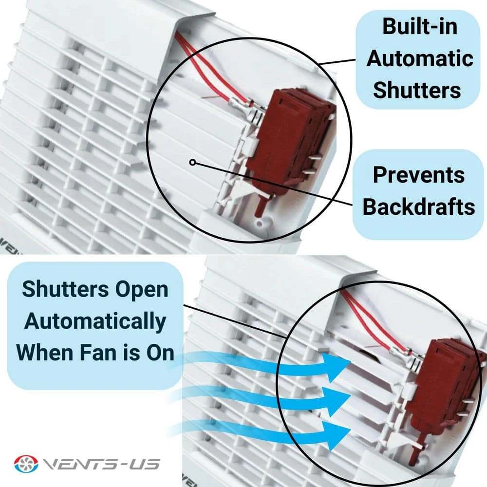 - Automatic Shutters: Built-in shutters open during operation and close when off to prevent backdrafts