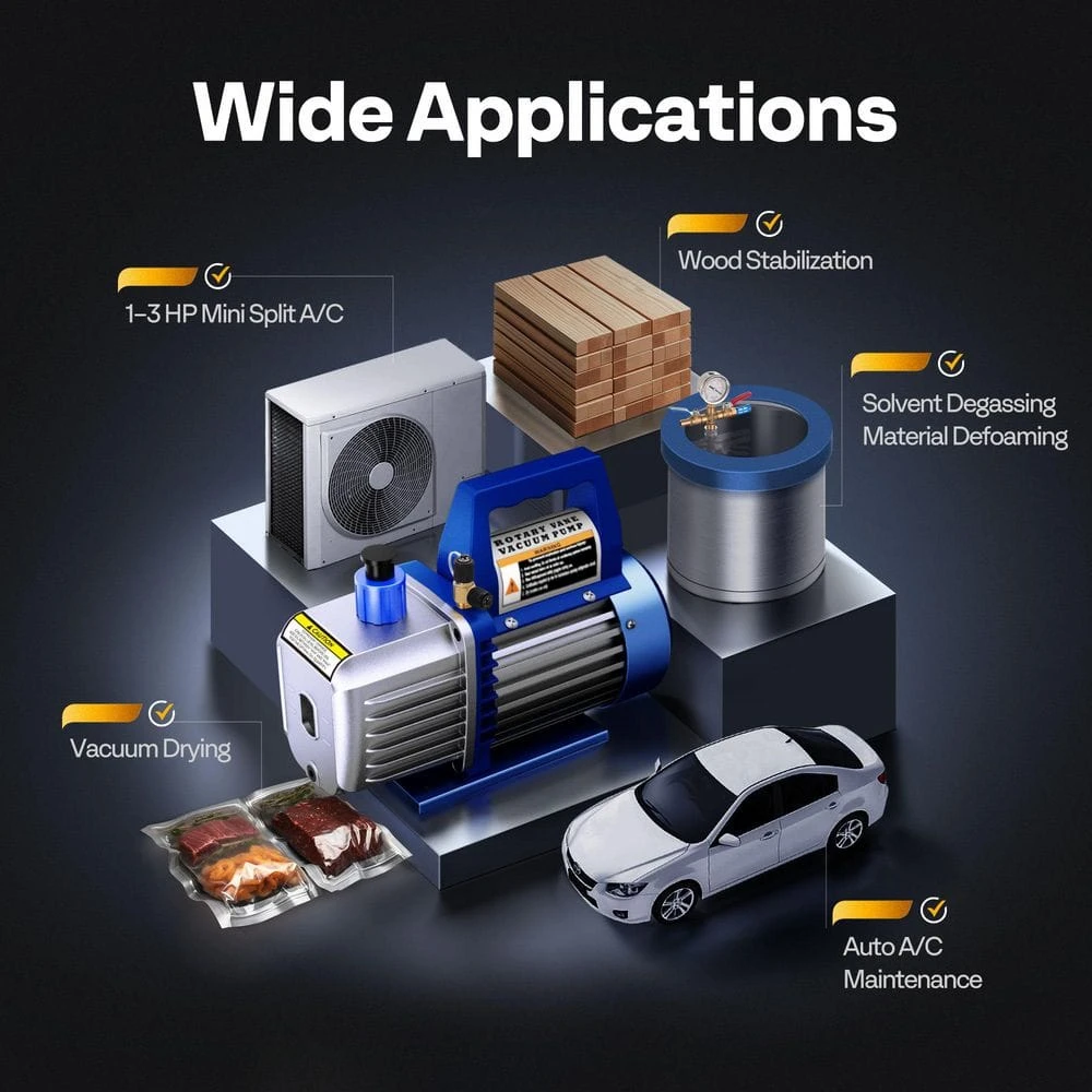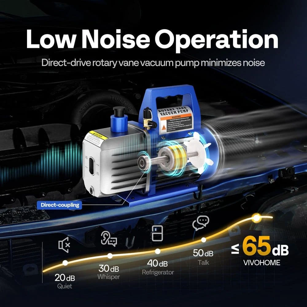 VIVOHOME air vacuum pump constructs with lightweight cast aluminum structure with maximum durability, precision machined gears, and multilayer filters show better performance. The single-stage air vacuum pump is designed for HVAC refrigeration recharging in daily life. VIVOHOME rotary vane air vacuum pump has high efficiency, low noise output, and a wide range of applications, suitable for household air conditioning, automobile maintenance, refrigerator vacuum, industry, etc.