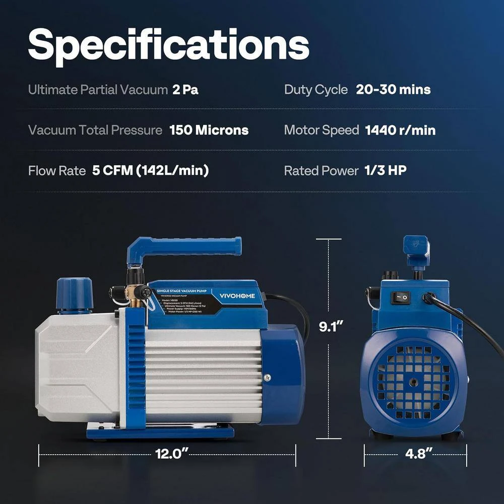 The VIVOHOME HVAC vacuum pump kit is a portable and versatile tool to enhance efficiency, durability and precision. With a strong motor, color-coded hoses and highly precise pressure gauge, It helps you diagnose and troubleshoot refrigeration equipment issues quickly and effectively. The kit is compatible with a variety of refrigerants, including R12, R134a, R22 and R410a, making it ideal for different vehicle HVAC systems. This vacuum pump and gauge set is perfect for HVAC system serving, refrigeration, vacuum packaging and other repair tasks that require high vacuum performance.