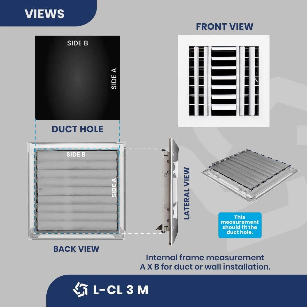 Laminaire’s 12 in. x 12 in. square aluminum air supply diffuser with adjustable curved blades offers 3-way airflow direction throughout your room. Designed for use in ceiling openings, installation is made easy with 2-screws included. Premium never rust aluminum construction with white painted finish provides lasting durability.