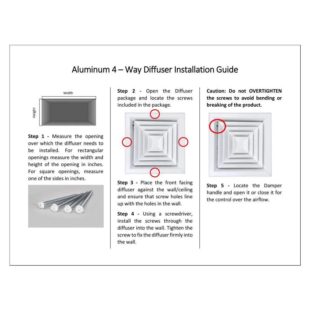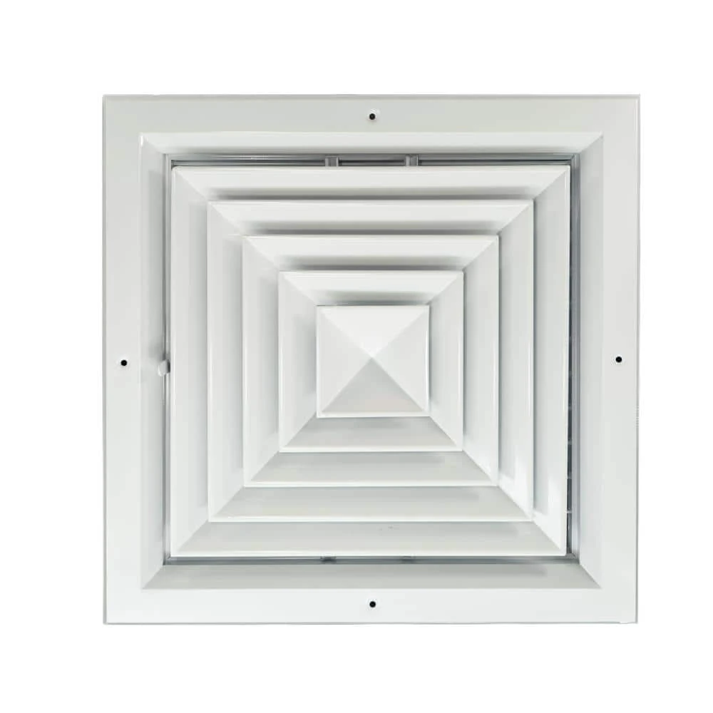 All aluminum square diffuser/grille with damper for square 12 in. x 12 in vent opening. The diffuser throws off air in four directions and ideal placement is away from the walls. Ideally suited for environments where rust can be an issue.