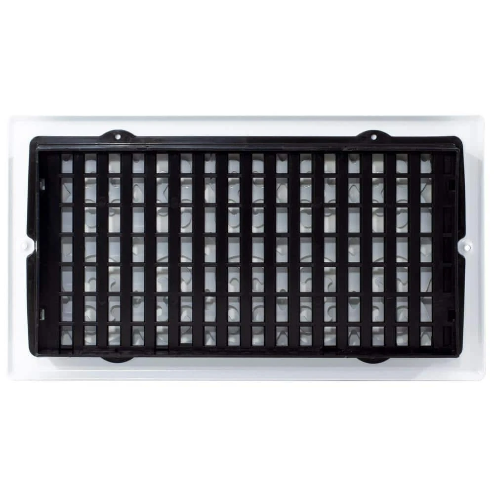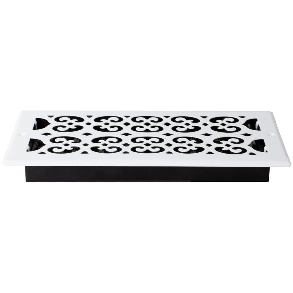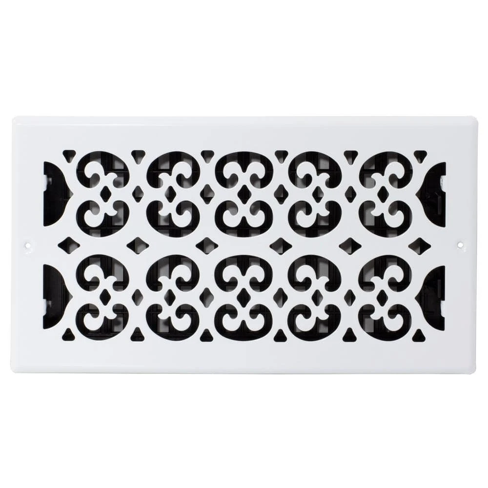 The 6 in. by 12 in. Scroll Design Steel wall/ceiling register is an elegant additional to any home decor. The painted white finish has a lacquered coating for added protection. Painted screws and pre drilled mounting holes are included for easy installation. The damper box is made from a high impact plastic, not metal which can rust and seize up. This is not a cheaper option, it’s the best option. Covers a 6 in. by 12 in. wall/ceiling opening.