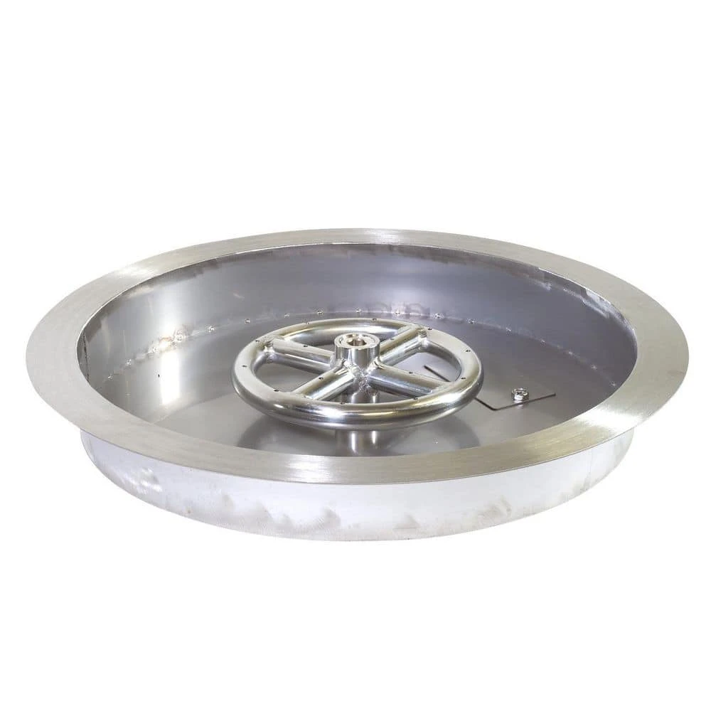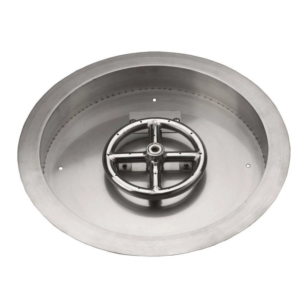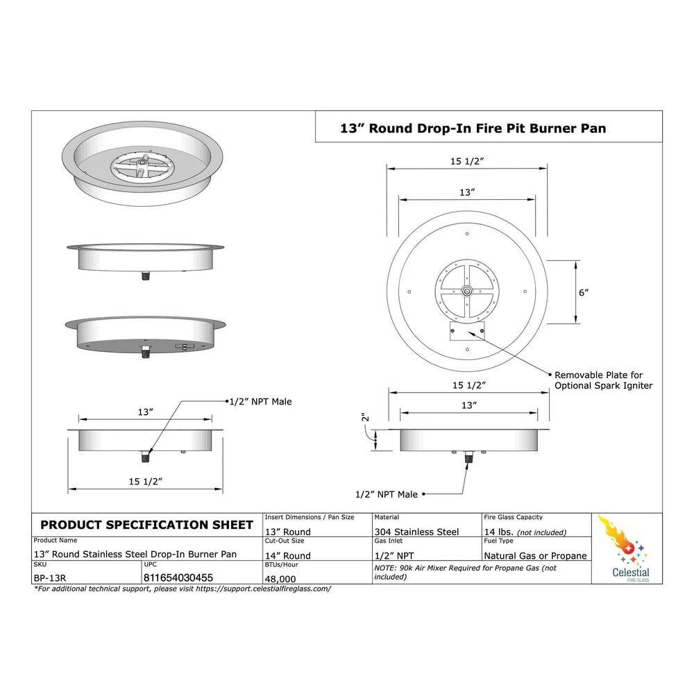 A fire pit is the perfect way to add style and ambiance to your backyard living area. Why spend hundreds on a pre-made cookie cutter unit when you can build your own with this round Drop-In Fire Pit Pan from Celestial Fire. Our 13 in. round pan has a 6 in. burner centered in the tray. The resulting flame is deeper and more centered for a classic camp fire look. Installation is a snap: Simply drop the 13 in. round burner pan into your fire pit, connect to a suitable gas source, and then watch the light show commence.