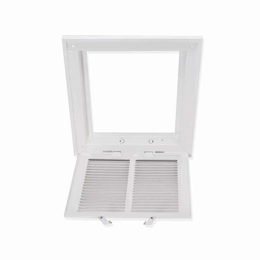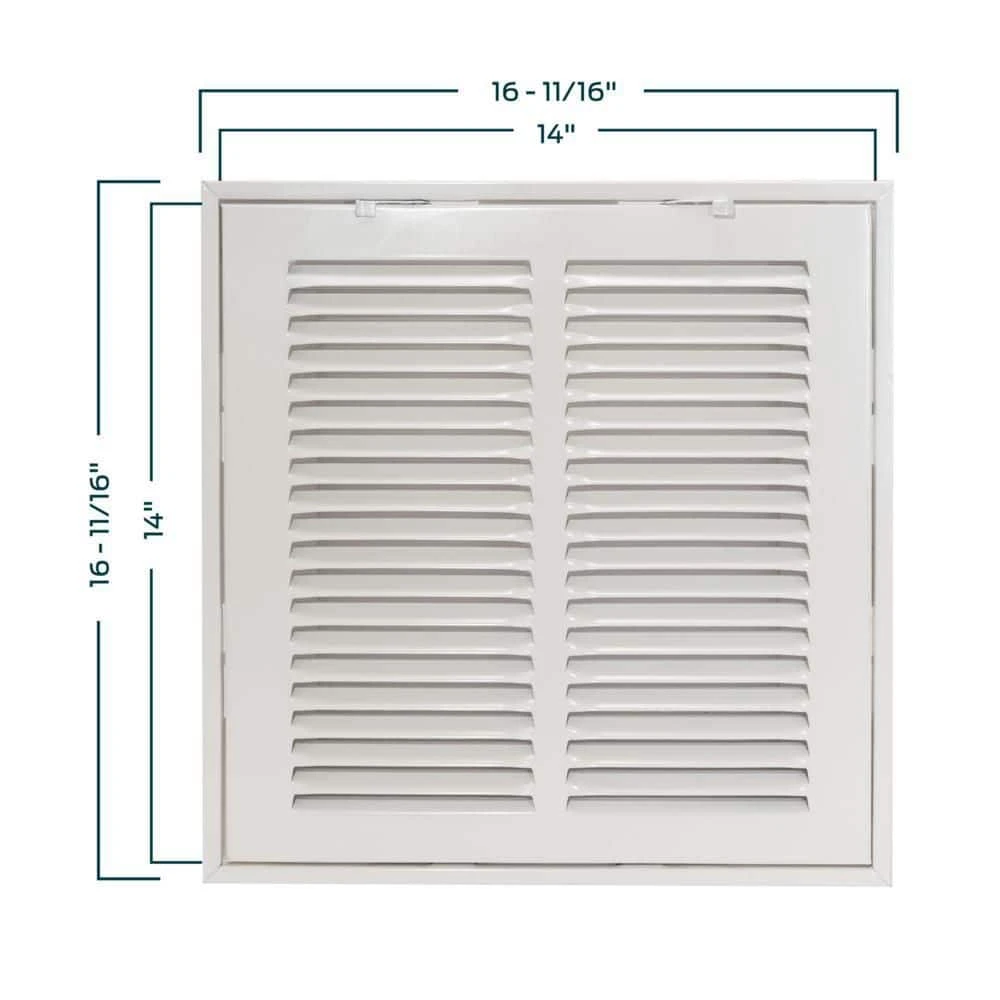 The EZ-FLO Return Air Filter Grille is designed for wall or ceiling openings on central air system plenums for mounting an air filter. It is made of heavy-duty steel with a white powder-coated finish that resists flaking and rust for a longer-lasting performance. It fits a rough duct opening 14 inches wide by 14 inches long. It features slotted vanes that are non-adjustable and in a fixed position and a hinged panel with two latches for easy air filter replacements. Includes (4) screws for easy installation. This return air filter grille accepts most 14-inch by 14-inch air filters. It is important to check the duct opening size before purchasing a return air filter grille.