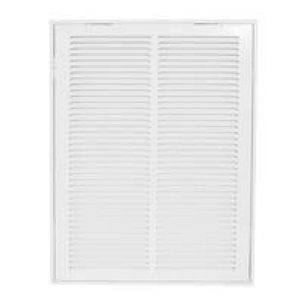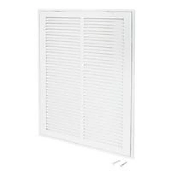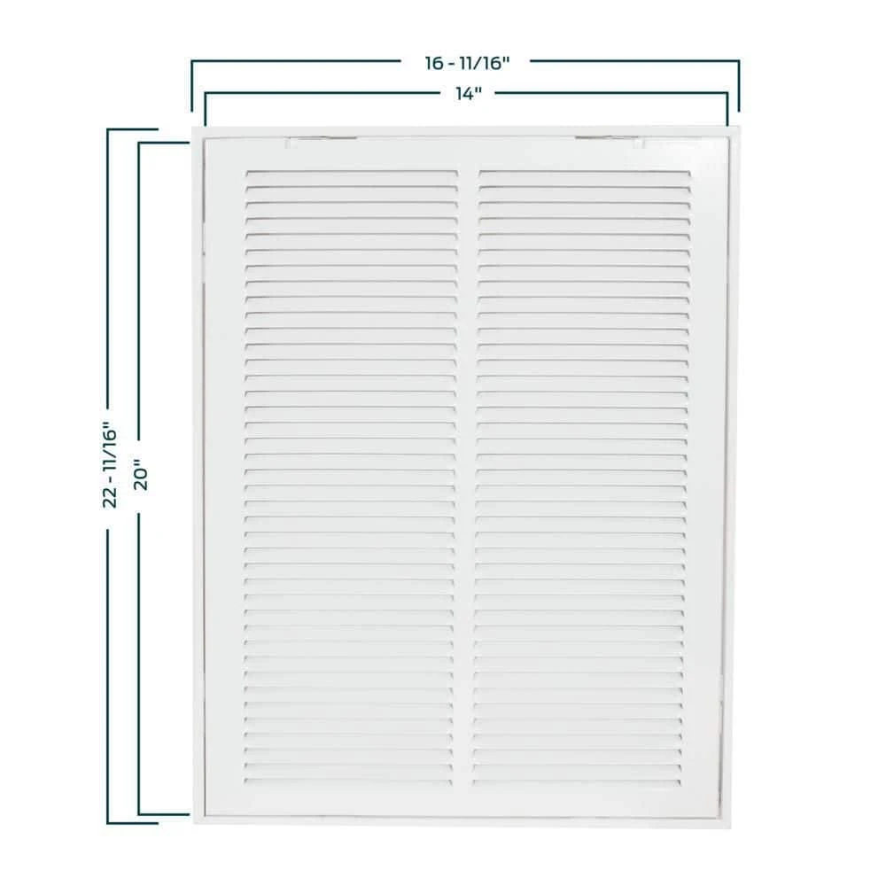 The EZ-FLO Return Air Filter Grille is designed for wall or ceiling openings on central air system plenums for mounting an air filter. It is made of heavy-duty steel with a white powder-coated finish that resists flaking and rust for a longer-lasting performance. It fits a rough duct opening 14 inches wide by 20 inches long. It features slotted vanes that are non-adjustable and in a fixed position and a hinged panel with two latches for easy air filter replacements. Includes (4) screws for easy installation. This return air filter grille accepts most 14-inch by 20-inch air filters. It is important to check the duct opening size before purchasing a return air filter grille.