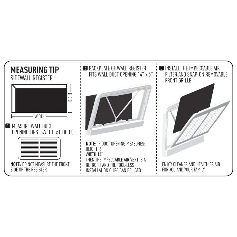 Experience a revolution in home air quality with the Impeccable Air 14 in. x 6 in. Baseboard Filtered Return Air Grille. Engineered for efficiency and aesthetic appeal, this advanced air grille not only enhances your home’s interior but also significantly improves air circulation and filtration. Our unique 2-piece design integrates a MERV 6-rated Activated Carbon filter that captures dust, pollen, and other airborne pollutants, ensuring your environment remains fresh and healthy. The grille’s removeable front cover makes it a breeze to set up and maintain, as the front cover allows for quick filter replacements and is dishwasher safe to maintain a clean, new look. Also, its durable ABS Plastic material ensures long-lasting performance without rusting or denting. Perfect for homeowners seeking to reduce allergens and improve their home environment, this grille is an essential upgrade. Enhance your indoor air quality today with Impeccable Air’s innovative solution-because breathing clean air at home should be a given, not a luxury.