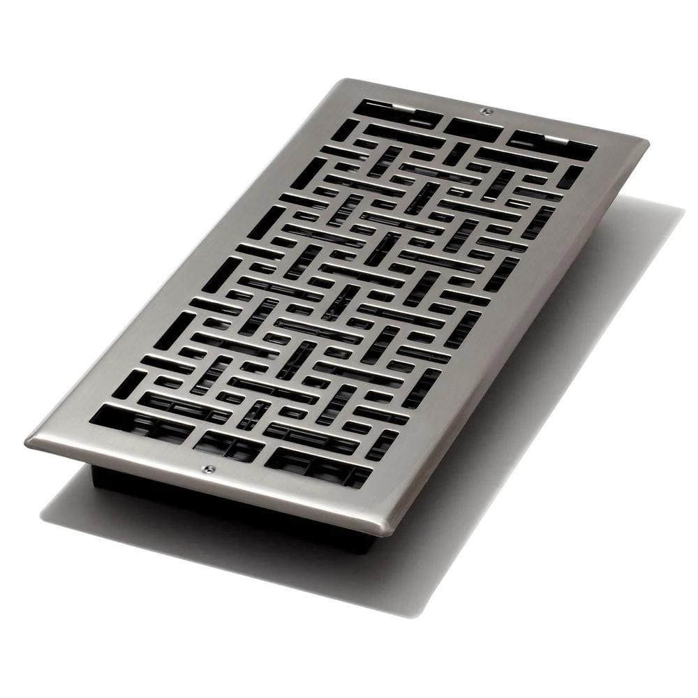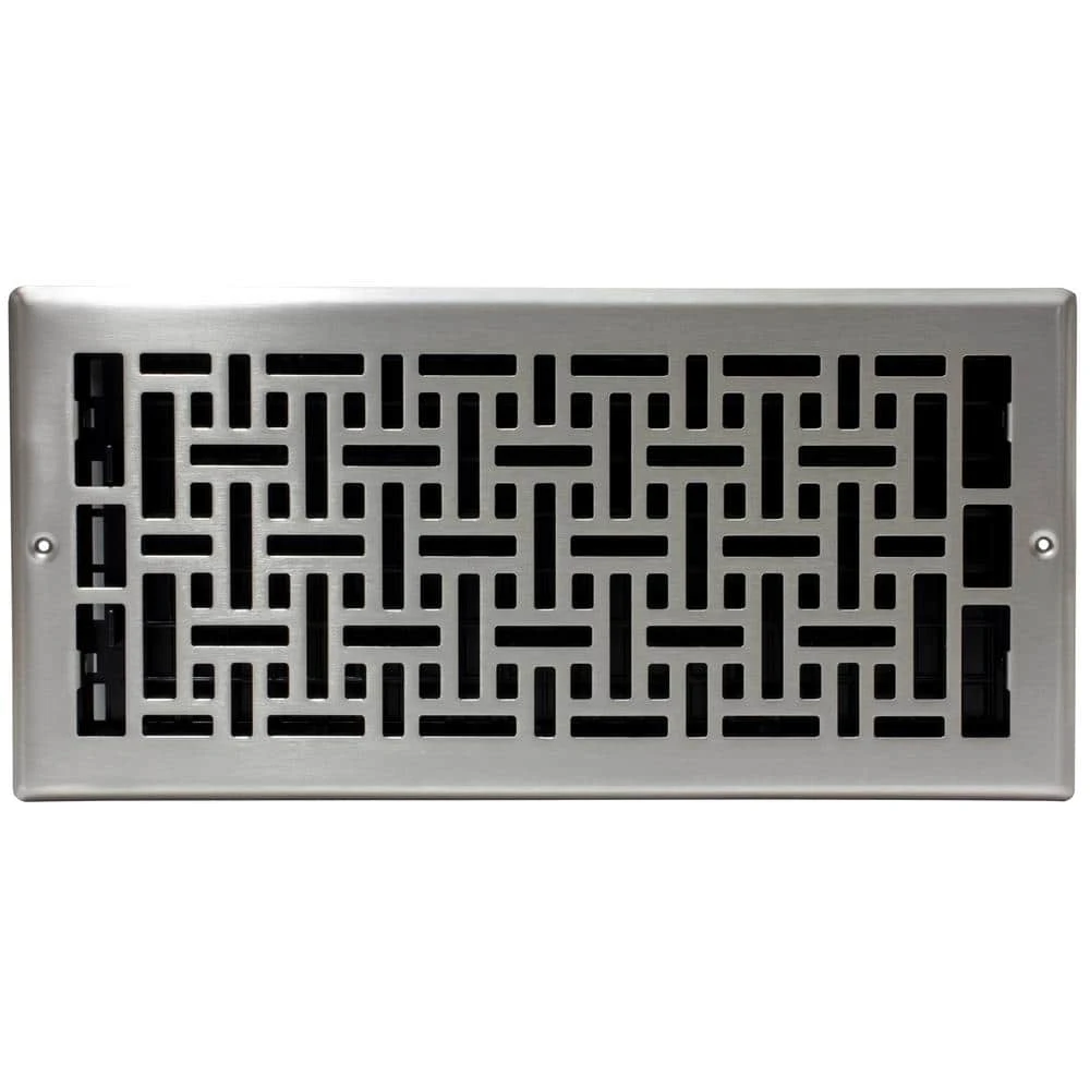 The 6 in. by 14 in. Oriental Design Steel wall/ceiling register is an elegant additional to any home decor. The brushed nickel finish has a lacquered coating for added protection. Steel screws and pre drilled mounting holes are included for easy installation. The damper box is made from a high impact plastic, not metal which can rust and seize up. This is not a cheaper option, it’s the best option. Covers a 6 in. by 14 in. wall/ceiling opening.