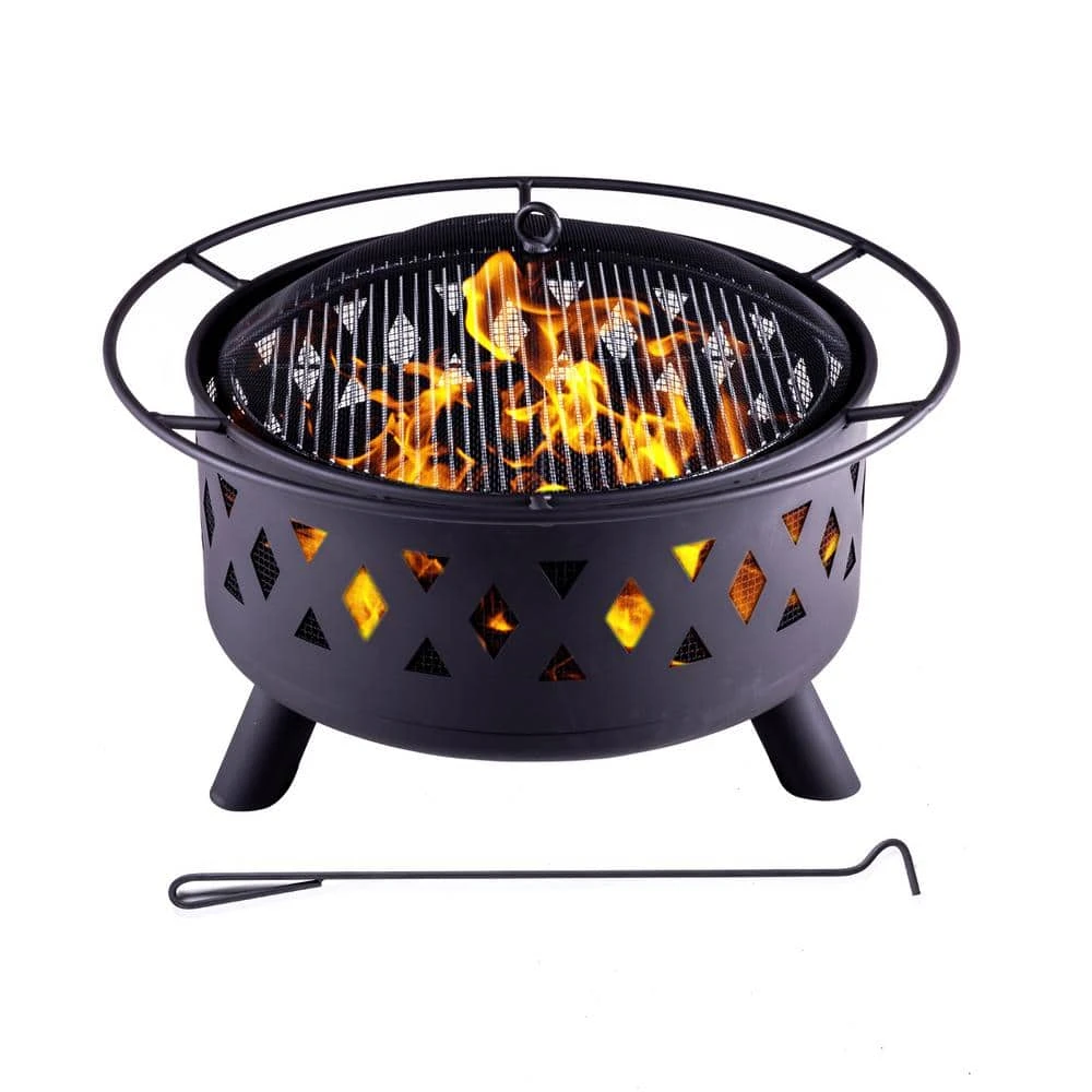 Enjoy the Fire Pit with a 360° view of the fire. It is ideal for entertaining friends and family gathering at your home. The heavy-duty steel construction and the painted rust finish will add a stylish touch to your outdoor living space. In addition, a grilling grate, cover and lifter for the spark screen are included.
