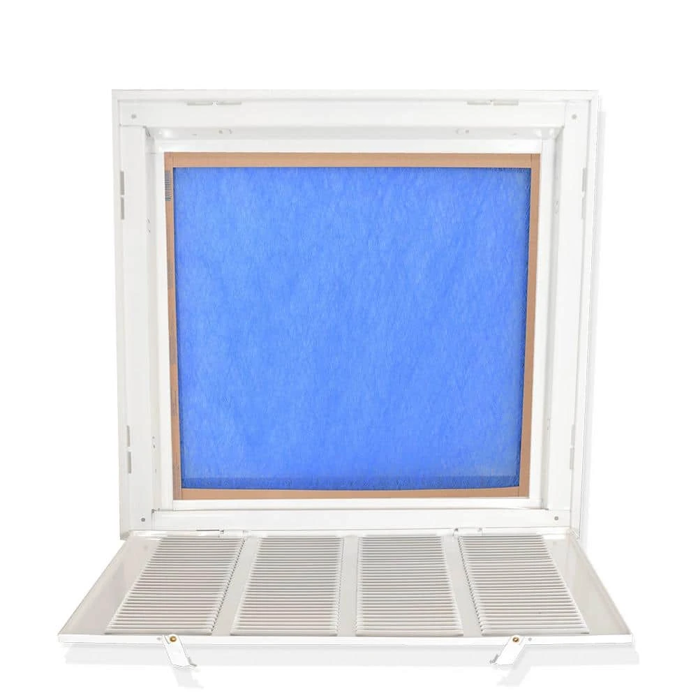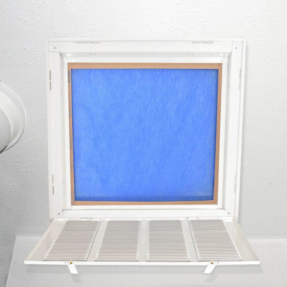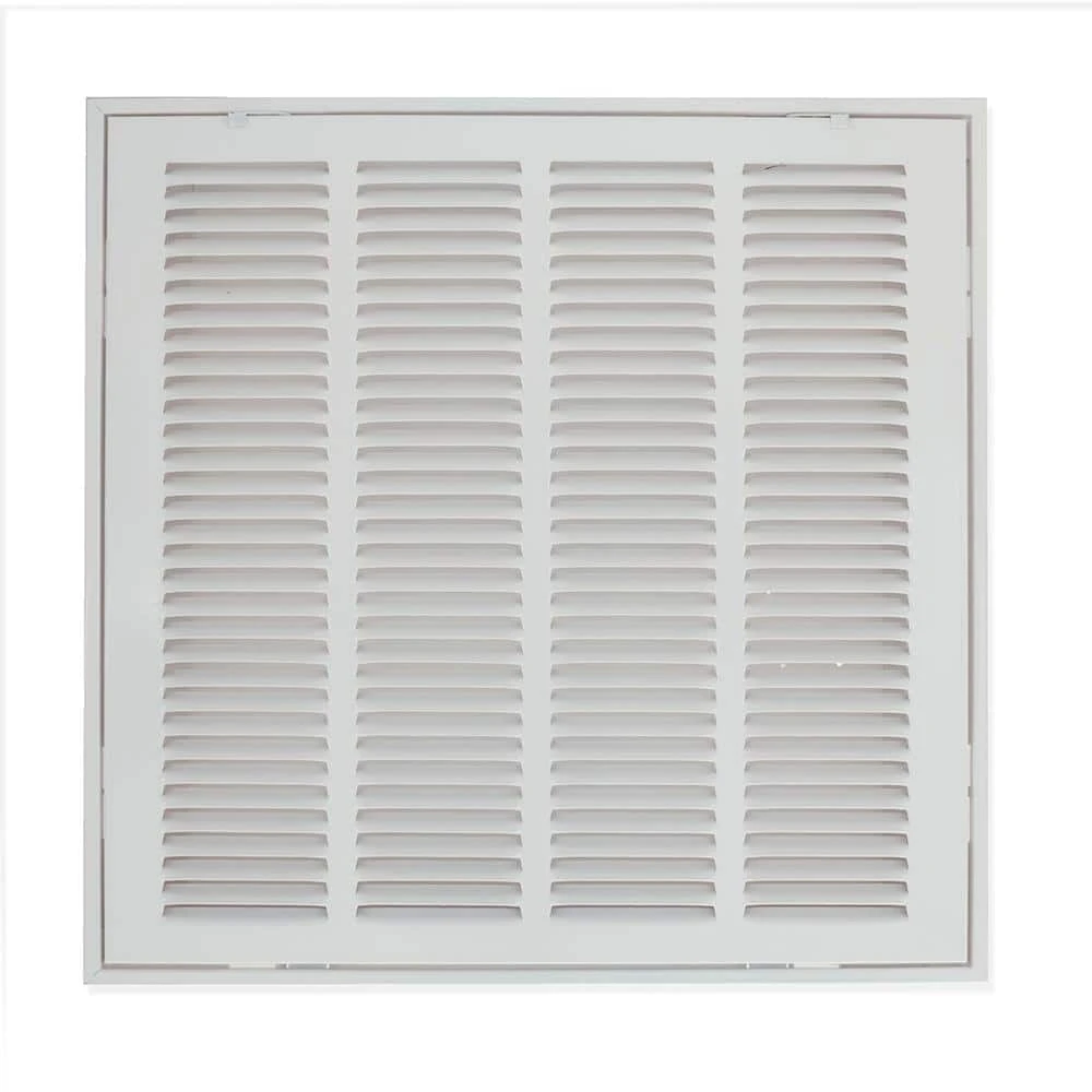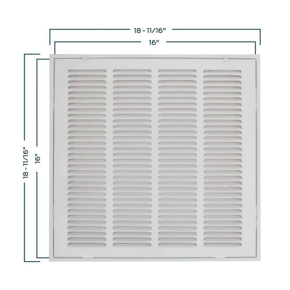 The EZ-FLO Return Air Filter Grille is designed for wall or ceiling openings on central air system plenums for mounting an air filter. It is made of heavy-duty steel with a white powder-coated finish that resists flaking and rust for a longer-lasting performance. It fits a rough duct opening 16 inches wide by 16 inches long. It features slotted vanes that are non-adjustable and in a fixed position and a hinged panel with two latches for easy air filter replacements. Includes (4) screws for easy installation. This return air filter grille accepts most 16-inch by 16-inch air filters. It is important to check the duct opening size before purchasing a return air filter grille.