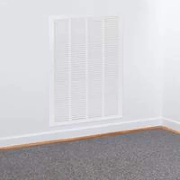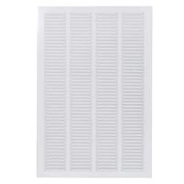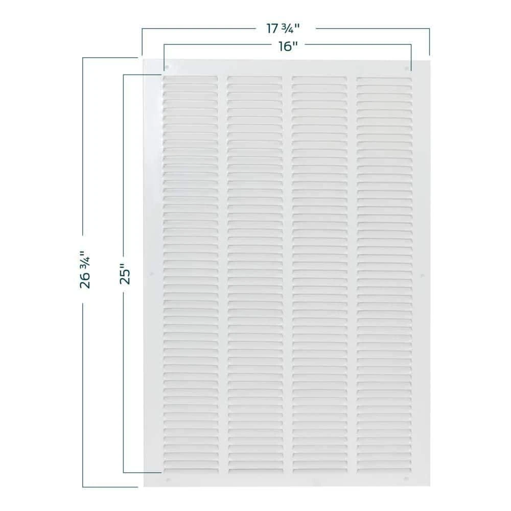 The EZ-FLO Return Air Grille is designed for wall or ceiling openings to help improve air circulation by extracting air from a room. It is made of heavy-duty steel with a white powder-coated finish that resists flaking and rust for a longer-lasting performance. It fits a rough duct opening 16 in. wide by 25 in. long. It features slotted vanes that are non-adjustable and in a fixed position. Includes (6) screws for easy installation. It is important to check the duct opening size before purchasing a duct or vent cover.