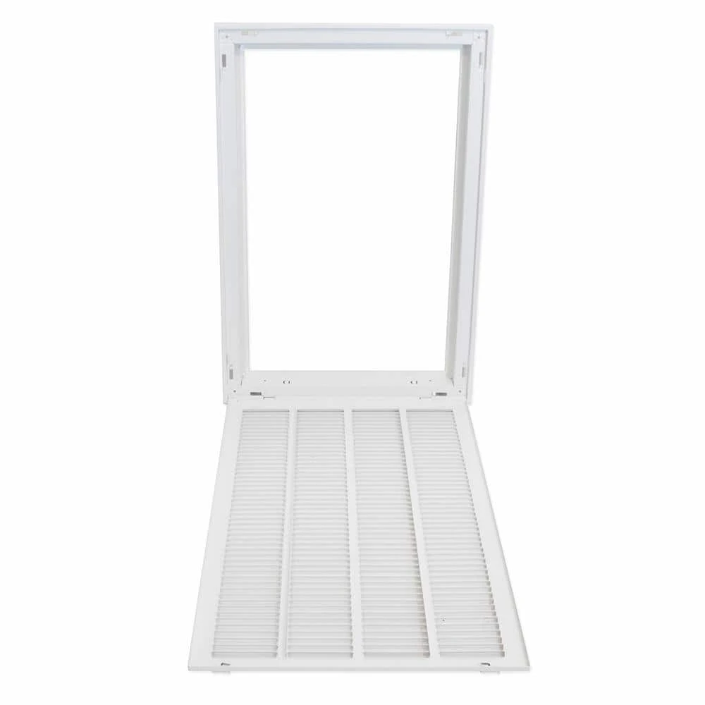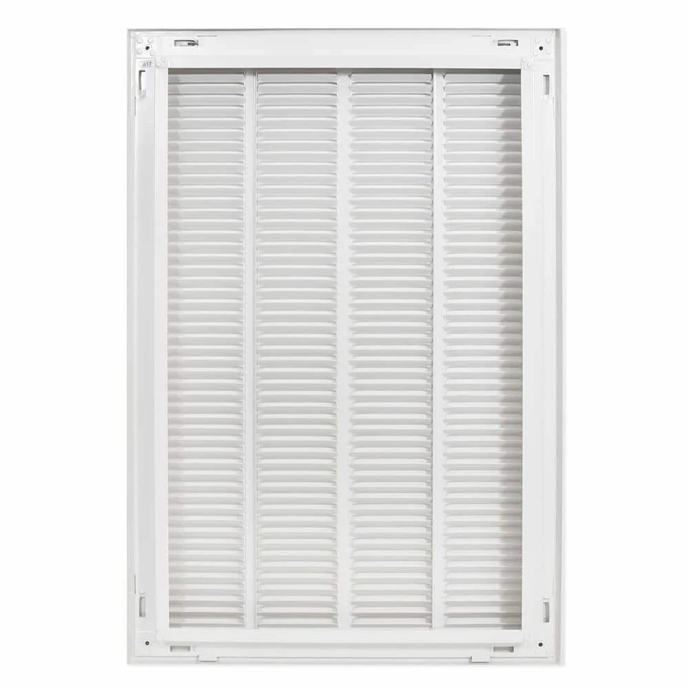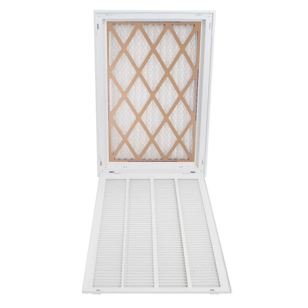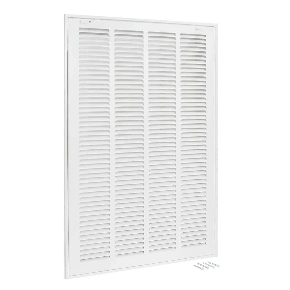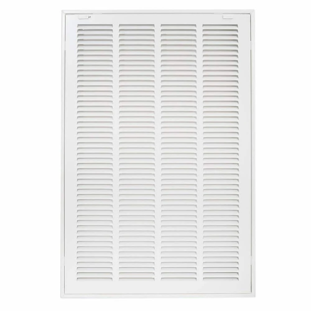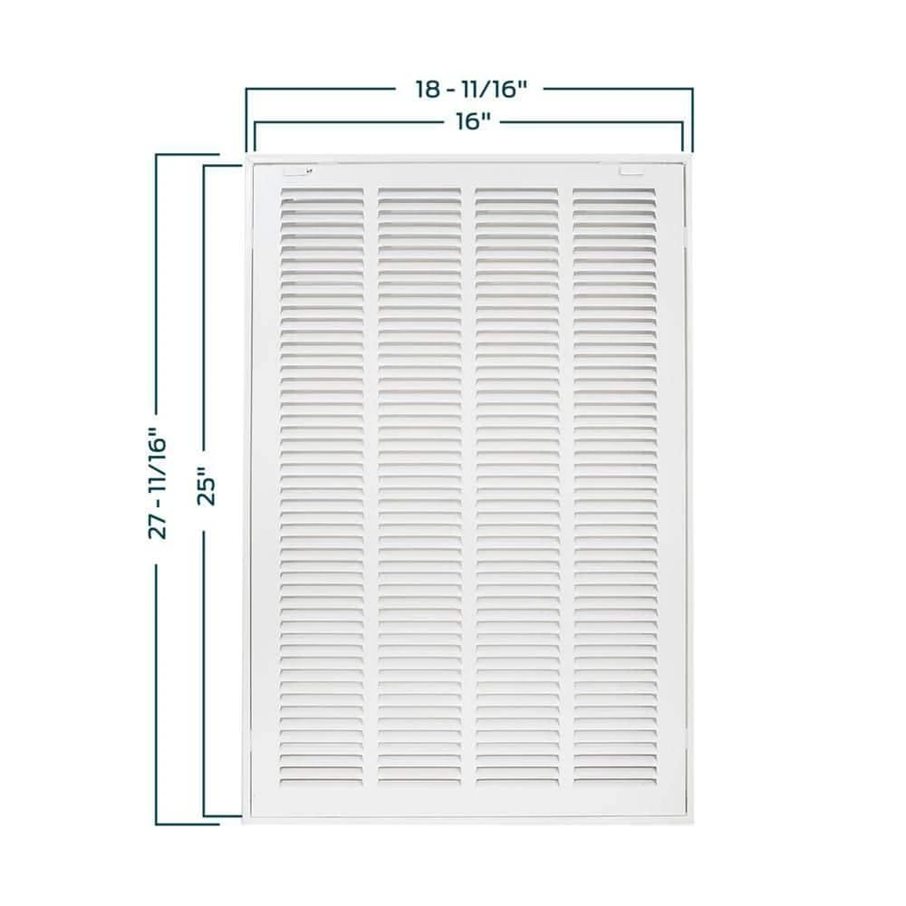 The EZ-FLO Return Air Filter Grille is designed for wall or ceiling openings on central air system plenums for mounting an air filter. It is made of heavy-duty steel with a white powder-coated finish that resists flaking and rust for a longer-lasting performance. It fits a rough duct opening 16 inches wide by 25 inches long. It features slotted vanes that are non-adjustable and in a fixed position and a hinged panel with two latches for easy air filter replacements. Includes (4) screws for easy installation. This return air filter grille accepts most 16-inch by 25-inch air filters. It is important to check the duct opening size before purchasing a return air filter grille.
