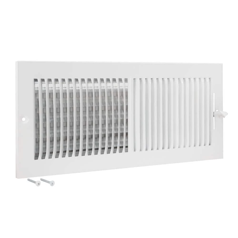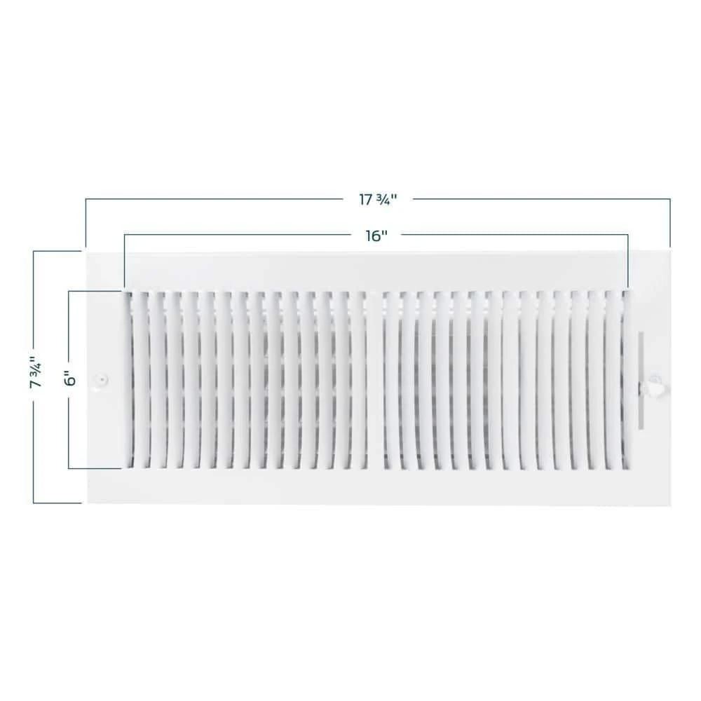 The EZ-Flo Wall/Ceiling Register is designed for wall or ceiling openings to control airflow for increased comfort. This register ensures quiet airflow from your central air system. It is made of heavy-duty steel with a white powder-coated finish that resists flaking and rust for a longer-lasting performance. It fits a rough duct opening 16 inches wide by 6 inches long. It features 2-way air deflection and five adjustable dampers for easy airflow adjustments. Includes (2) screws for easy installation. It is important to check the duct opening size before purchasing a duct or vent cover.