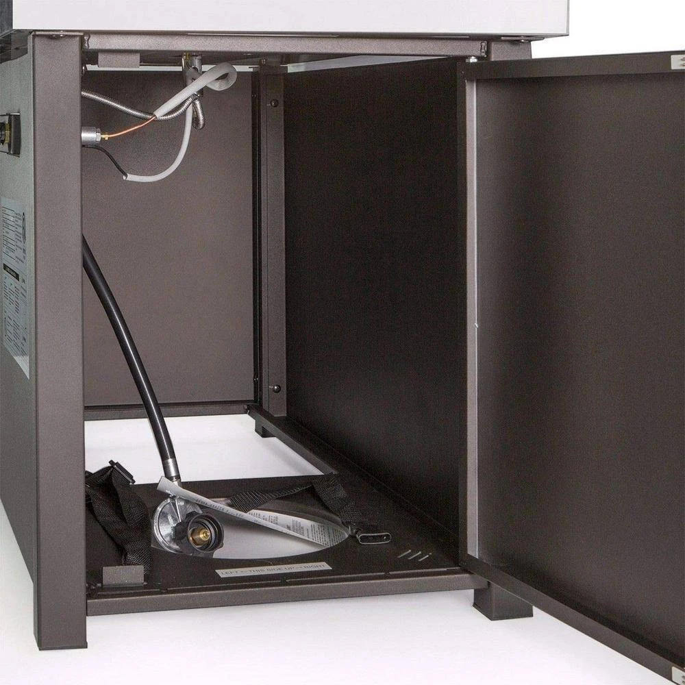 - Easy-access opening at base of fire put used to hold the propane tank, requires a 20 lbs. LPG tank (not included)