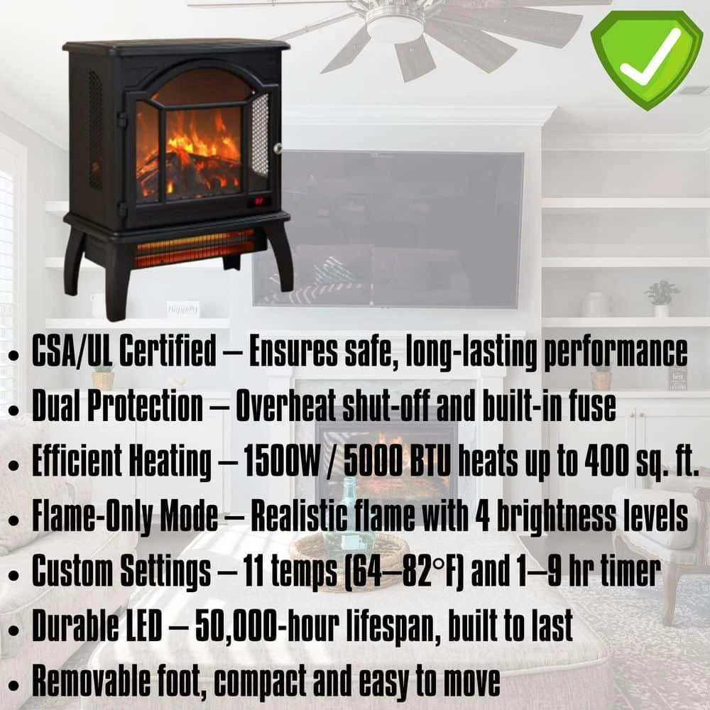 Looking for a fireplace that guarantees safety and long-term reliability? With CSA/UL certification ensuring top-notch service, this electric fireplace offers dual safety protection: an overheat protection device and a fuse for added security. Delivering 1500W of heat (equivalent to 5000 BTUs), it efficiently warms up to 400 sq. ft., saving you m 1y on heating bills. Simply plug it into any standard 120V outlet and enjoy its flame effect without heat, adjustable in 4 brightness settings for ambiance. Featuring a timer function (1 to 9 hours) and 11 temperature settings (64°F to 82°F), it’s easy to customize your comfort. With a durable LED light source lasting up to 50,000 hours, this portable fireplace is compact and movable, ideal for any space. Plus, its infrared quartz heat maintains room humidity for comfortable warmth without drying out the air. Ready to enhance your home with style and functionality?