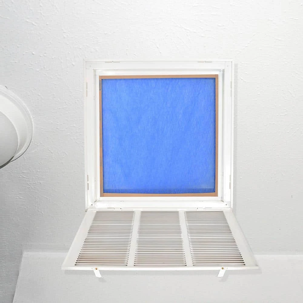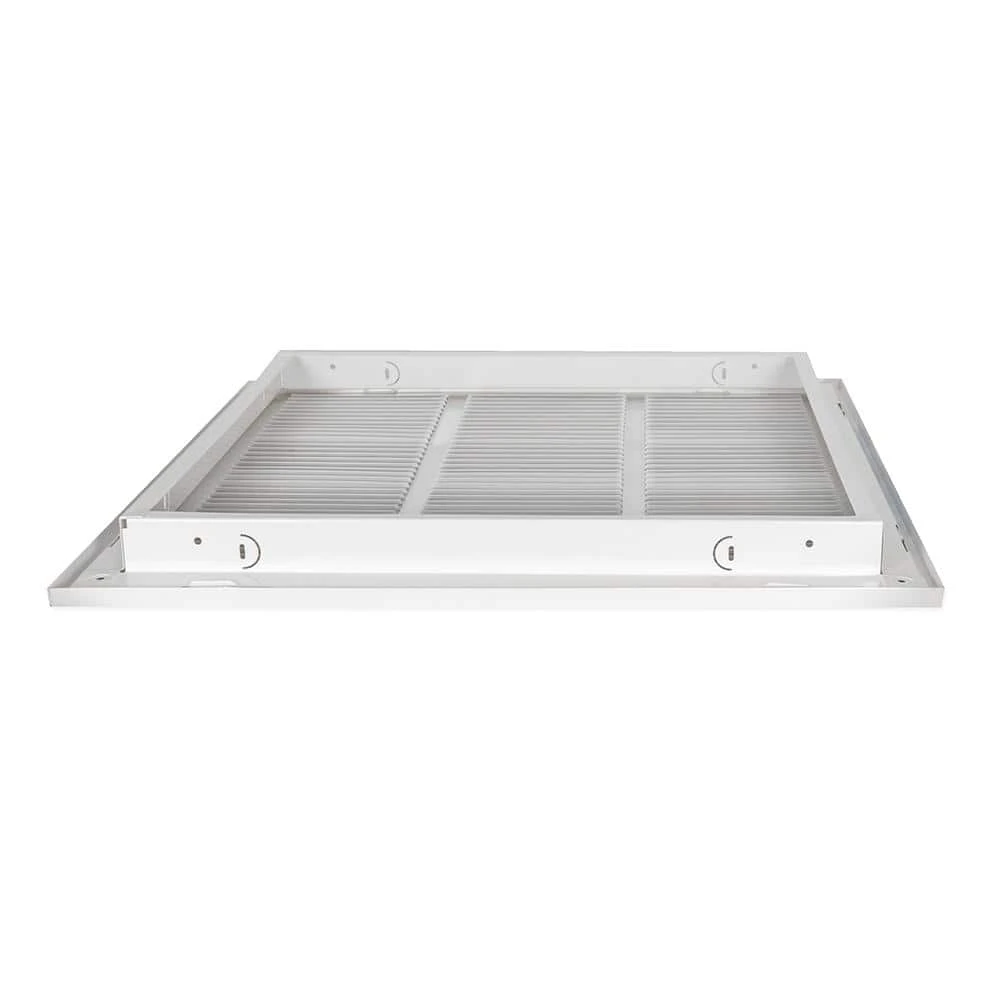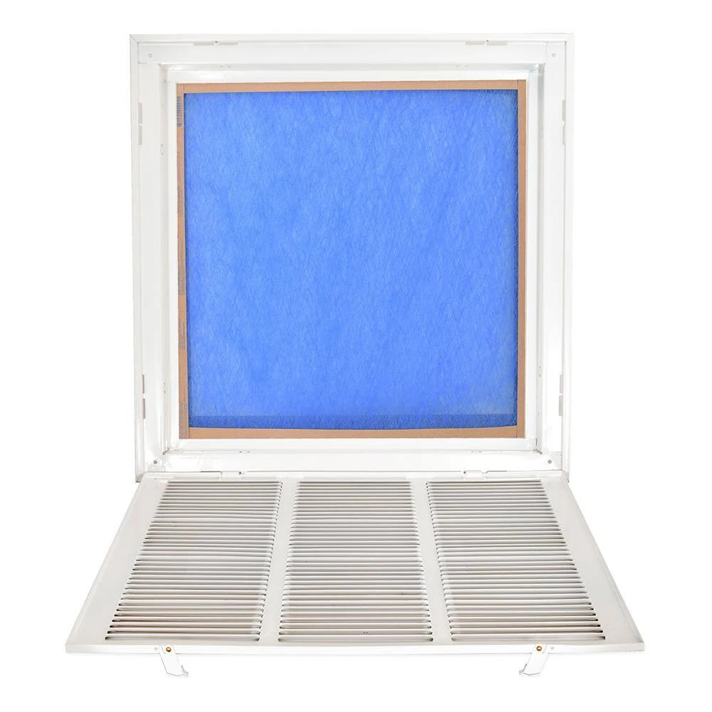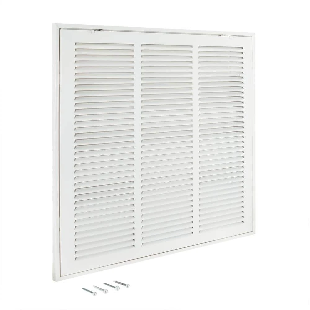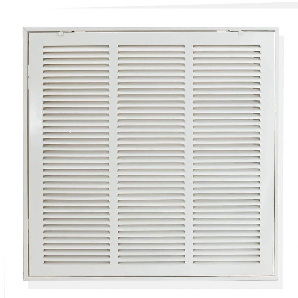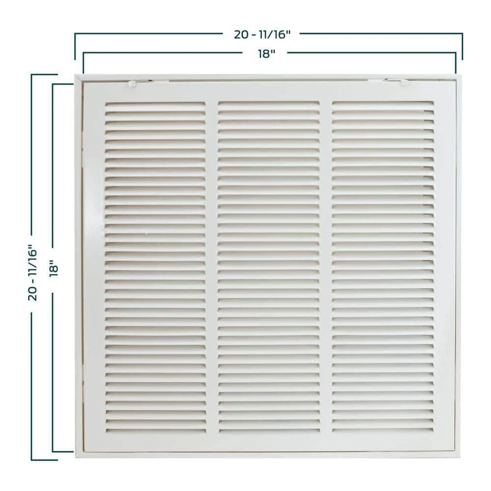 The EZ-FLO Return Air Filter Grille is designed for wall or ceiling openings on central air system plenums for mounting an air filter. It is made of heavy-duty steel with a white powder-coated finish that resists flaking and rust for a longer-lasting performance. It fits a rough duct opening 18 inches wide by 18 inches long. It features slotted vanes that are non-adjustable and in a fixed position and a hinged panel with two latches for easy air filter replacements. Includes (4) screws for easy installation. This return air filter grille accepts most 18-inch by 18-inch air filters. It is important to check the duct opening size before purchasing a return air filter grille.