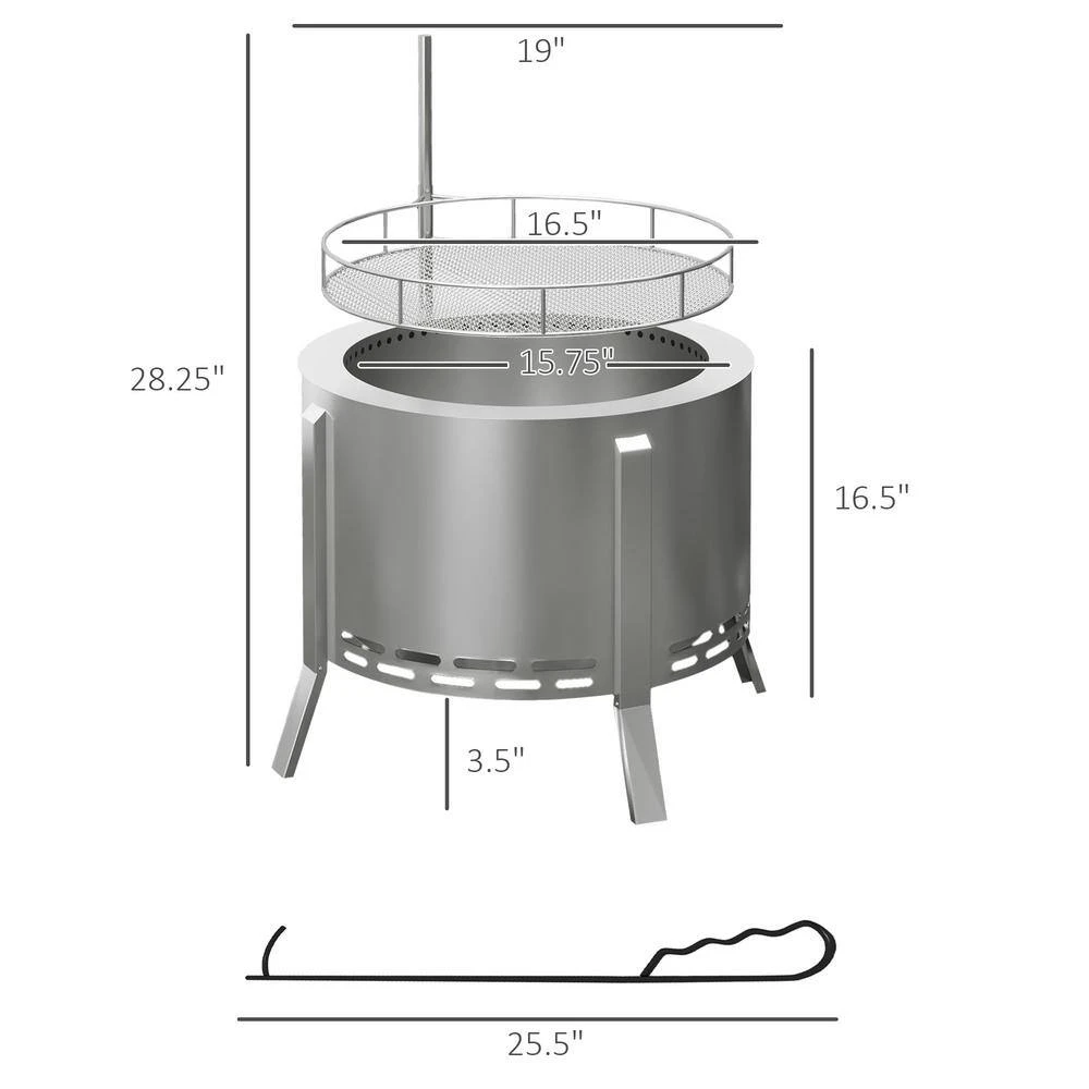 - Smokeless backyard fire pit with BBQ grill grate info: overall dimension: 19 in. Dia x 165 in. H, inner wood burning space: 1575 in. Dia, poker length: 255 in.