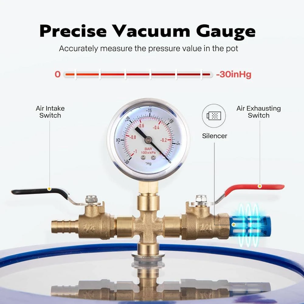 Experience unparalleled performance with this VIVOHOME Vacuum Chamber. It is designed for precision, reliability and versatility, this chamber is your gateway to flawless degassing, resin casting and beyond. Elevate your craft and achieve professional-quality results effortlessly. It comes equipped with a gauge filled with silicone oil that offers superior performance in shock absorption and crystal-clear readings of the operating vacuum pressure, allowing you to keep track of the entire vacuuming process effortlessly. It is ideal for hobbyists, DIY enthusiasts and professional craftsmen who require an efficient and reliable vacuum chamber for their crafts and experiments.