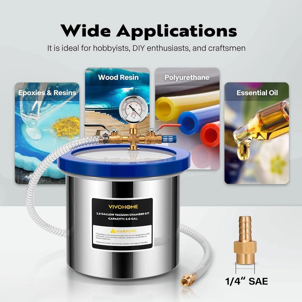 - VIVOHOME vacuum chamber kit includes a vacuum chamber with an acrylic lid, a silicone oil-filled gauge, a silicone pad and a hose