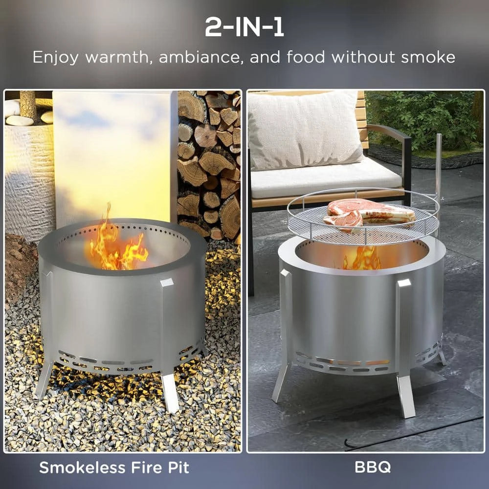 Elevate your outdoor gatherings with our 2-in-1 Smokeless Fire Pit and BBQ Grill. Enjoy the warmth and ambiance of a fire pit while cooking your favorite meals without the hassle of smoke. This versatile wood-burning fire pit features a secondary combustion system that burns away smoke for a cleaner, more enjoyable experience. The included grill grate allows for convenient cooking, and the poker helps maintain a perfect flame. Crafted from durable stainless steel, this fire pit is built to withstand various weather conditions, making it perfect for camping, picnics, and backyard gatherings.