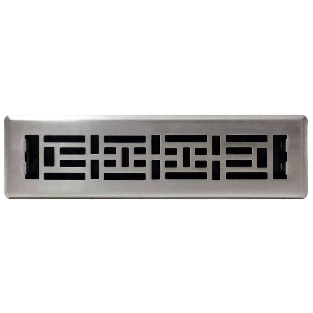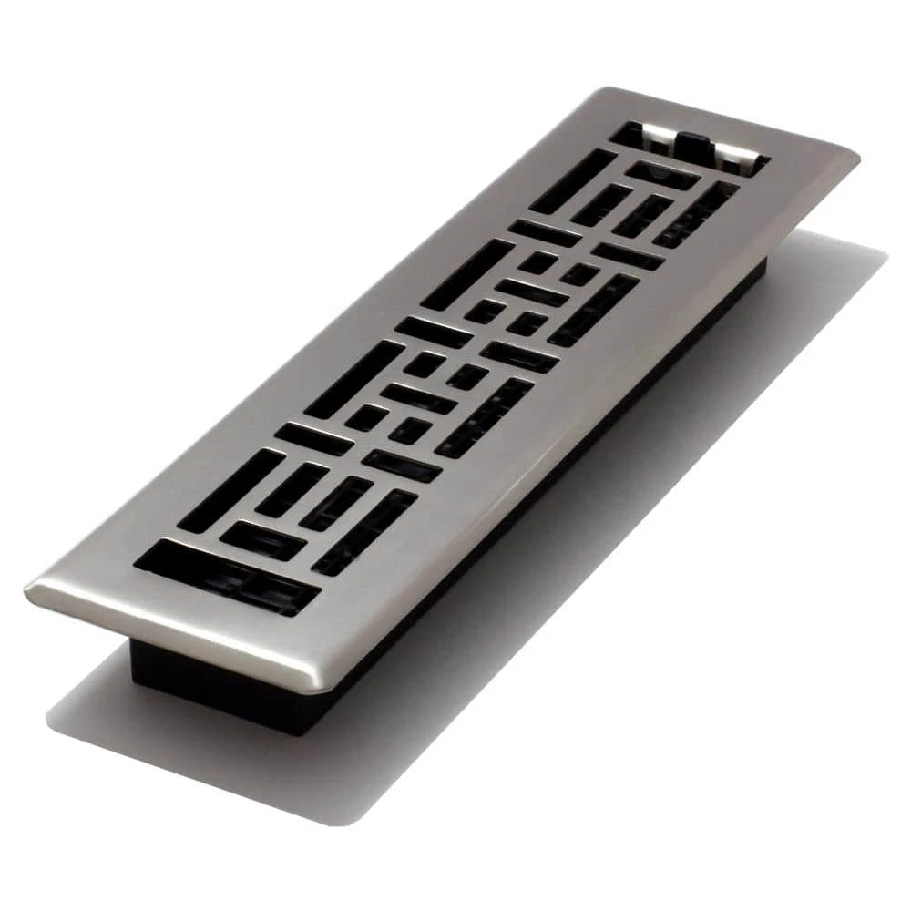 The 2 in. x 12 in. Oriental Design Steel Floor Register is an elegant addition to any home decor. The brushed nickel finish has a lacquered coating for added protection. The damper box is made from a high impact plastic, not metal which can rust and seize up. This is not a cheaper option, it’s the best option. The register fits a 2 in. x 12 in. opening.