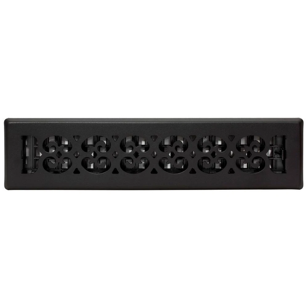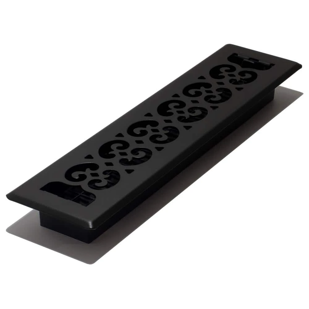 The 2 in. x 14 in. Scroll Design Steel Floor Register is an elegant addition to any home decor. The powder coated textured black finish compliments any style. The damper box is made from a high impact plastic, not metal which can rust and seize up. This is not a cheaper option, it’s the best option. The register fits a 4 in. x 08 in. opening.