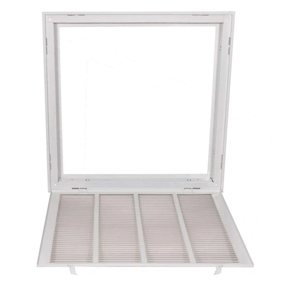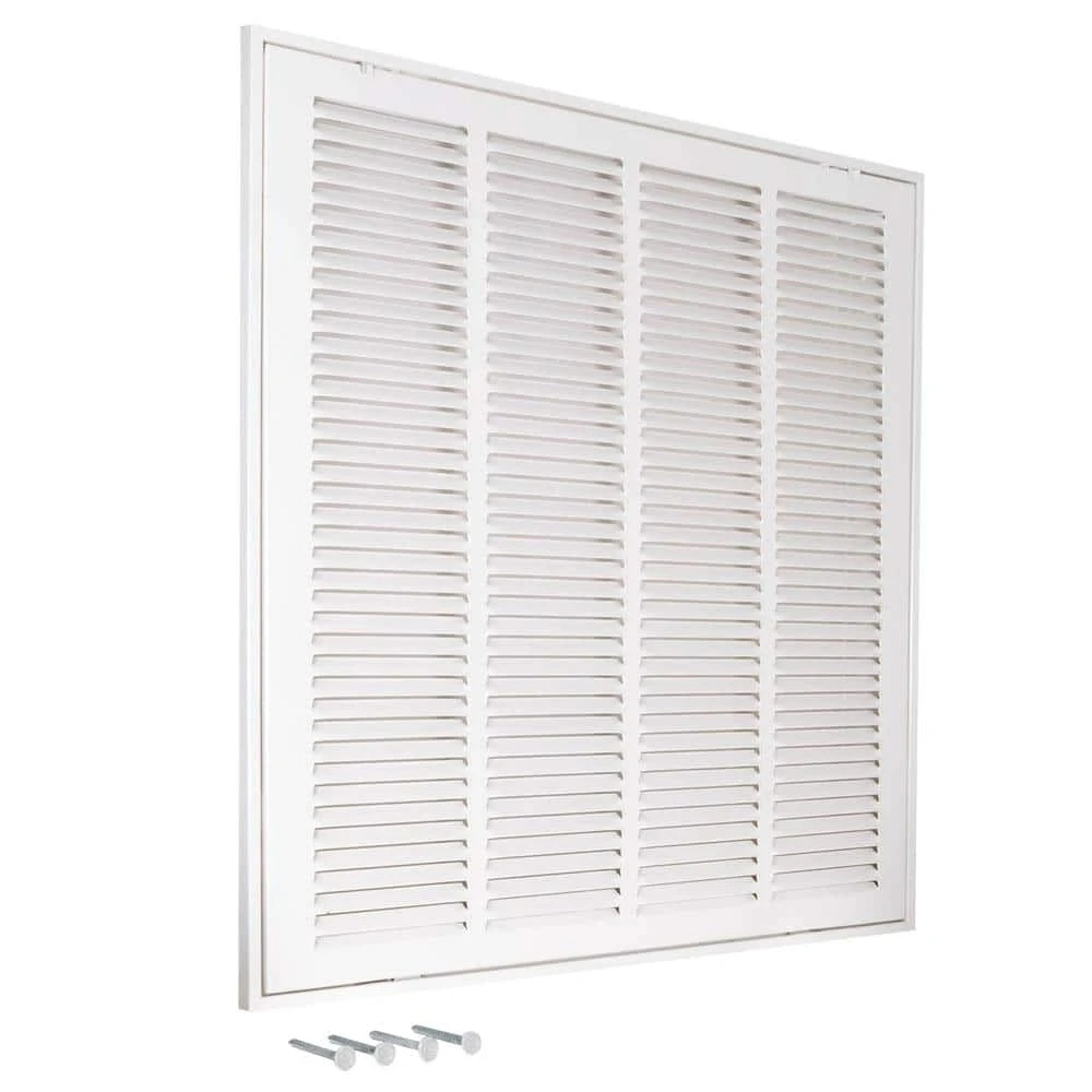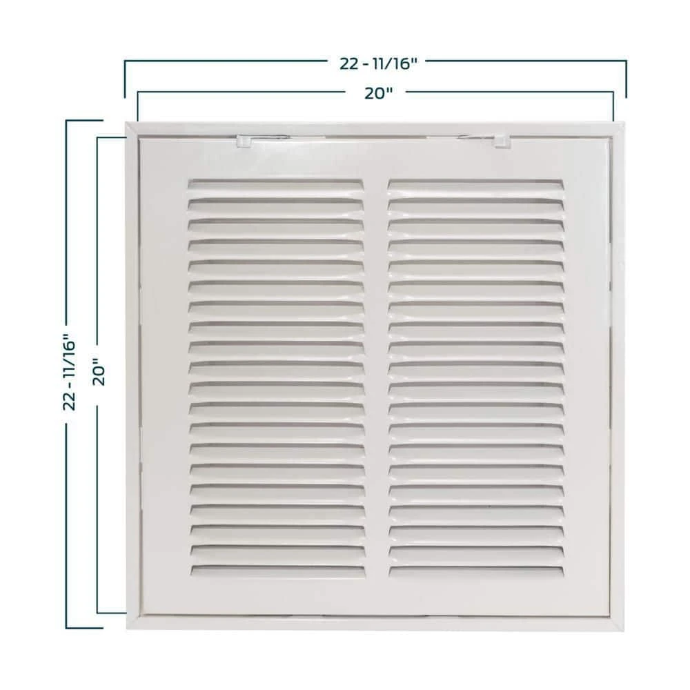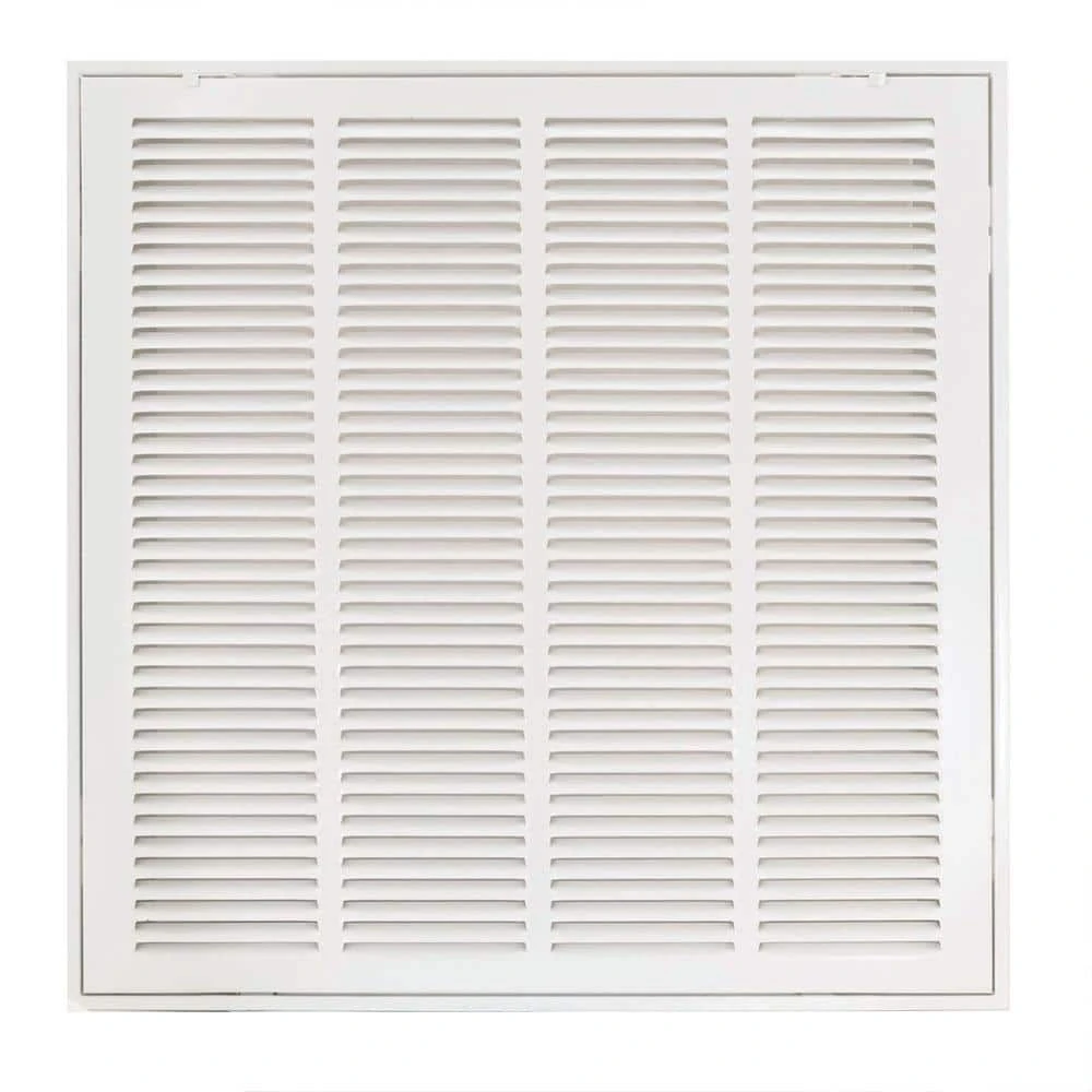 The EZ-FLO Return Air Filter Grille is designed for wall or ceiling openings on central air system plenums for mounting an air filter. It is made of heavy-duty steel with a white powder-coated finish that resists flaking and rust for a longer-lasting performance. It fits a rough duct opening 20 inches wide by 20 inches long. It features slotted vanes that are non-adjustable and in a fixed position and a hinged panel with two latches for easy air filter replacements. Includes (4) screws for easy installation. This return air filter grille accepts most 20-inch by 20-inch air filters. It is important to check the duct opening size before purchasing a return air filter grille.