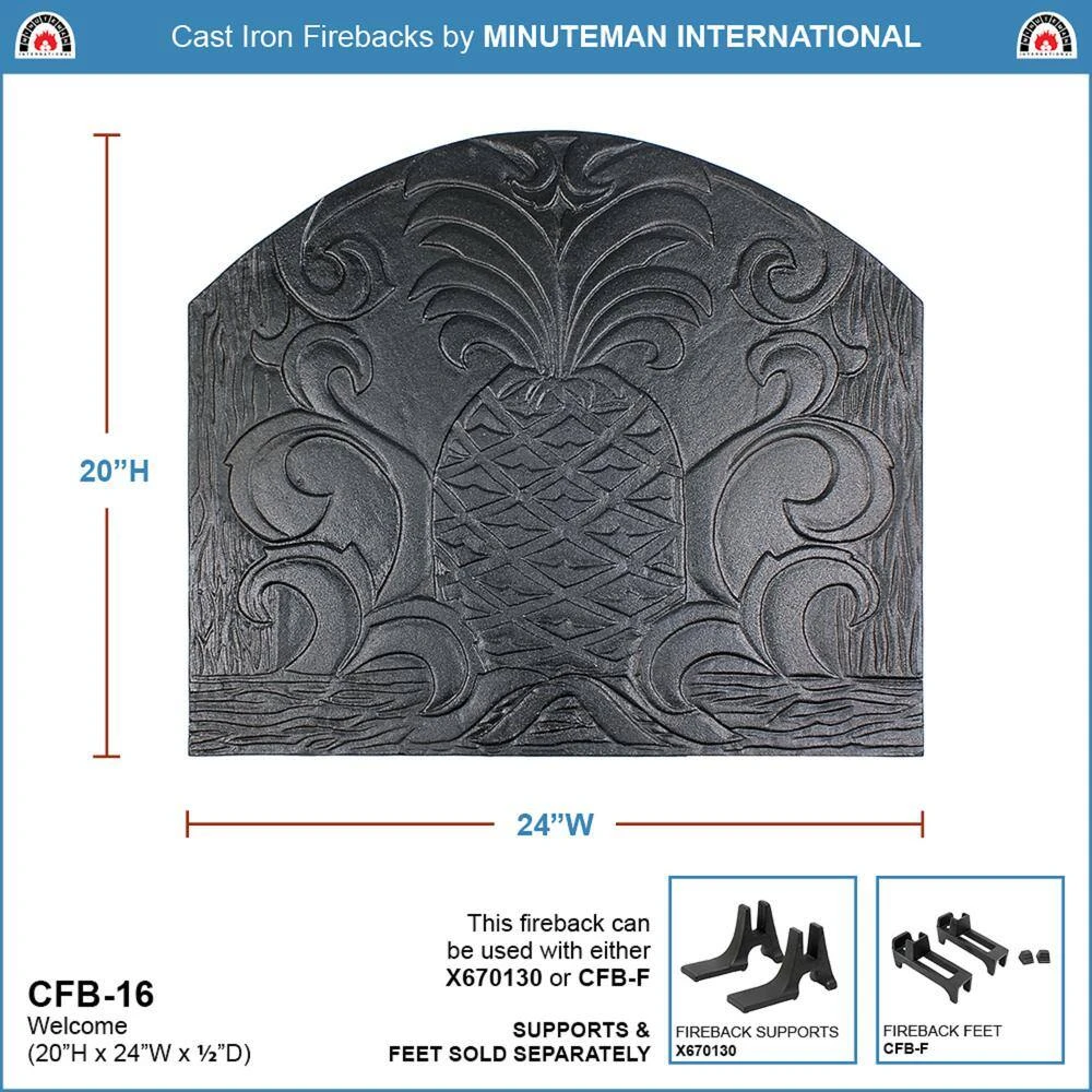 - Dimensions and options: measures 24 in. L x 20 in. H and it may be used directly on the hearth floor or with feet if additional height is desired, by using MINUTEMAN INTERNATIONAL fireback supports (X670130) or fireback feet (CFB-F)
