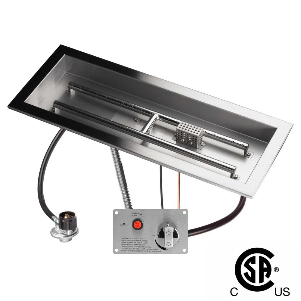 Get your outdoor party started quicker with a CSA drop-in burner kit for propane gas fire pits. The kit comes with everything you need (except batteries for your spark igniter). Cut the appropriately sized hole in your fire pit tabletop, make a couple of connections, and you’re good to go! It’s all in the box.Plus, a CSA-certified fire pit burner offers numerous safety features. For instance, the flame-sensing thermocouple avoids an accidental explosion by automatically shutting off the gas if no heat is detected.These safety features help take human error out of the equation. You know a product is authentic by the CSA hang tag. Any project that must pass an inspection will require CSA appliances with the tag still attached.This kit also offers convenience with a built-in spark igniter. Now you can light your fire with a push of a summary, no matches or stick lighter needed. Flame height adjustment is made with the turn of a knob.This rectangular burner and pan are crafted from hard-wearing, 304 stainless-steel in 16-gauge. The low- maintenance, brushed stainless-steel finish and beveled lip give this unit a high-end look that will stand the test of time.Great looks and ease of operation make this CSA-certified, drop-in burner kit a must-have for your DIY fire pit creation.