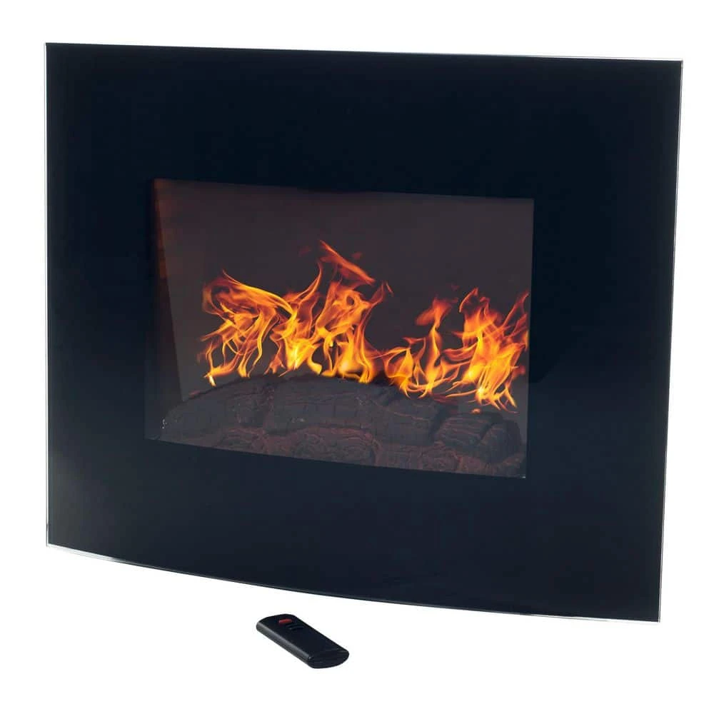 Elevate both the warmth and ambiance of your room with this Wall-Mounted Electric Fireplace by Northwest. Featuring two heat level settings and a log flame effect you can brighten and dim, this space-saving wall fireplace boasts a flat black curved glass design that infuses living rooms, bedrooms, and dens with modern charm. Operate this electric fireplace heater easily with the included remote control for fuss-free warmth that requires no fireplace tools or open flames.