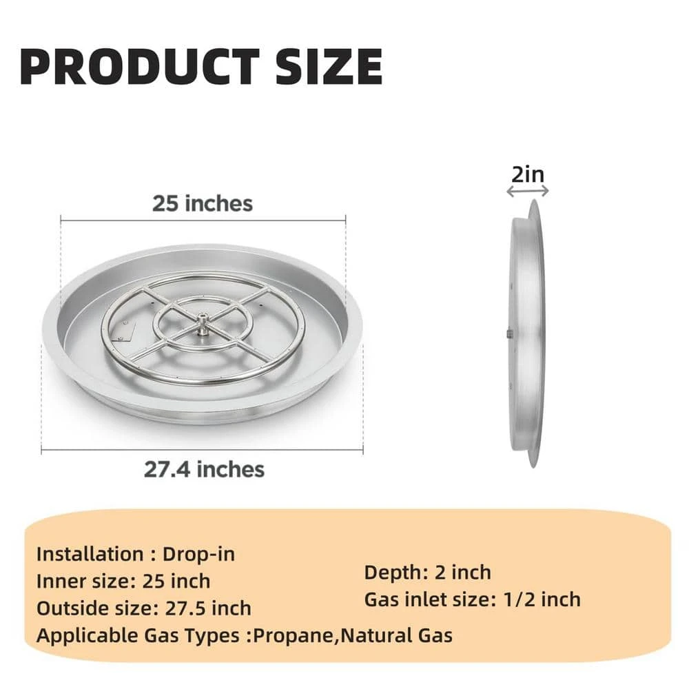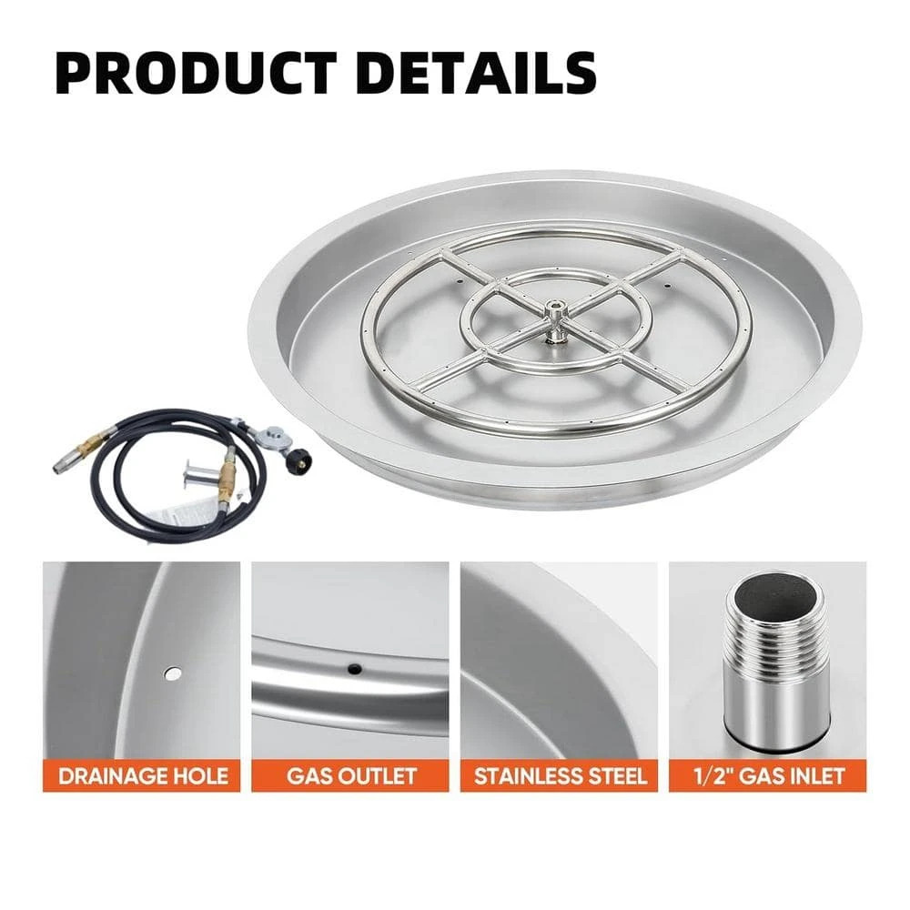 Durable Material – The fire pit burner is crafted from stainless steel, which can withstand high temperatures, resist bending, and is corrosion-resistant. This ensures airtightness while providing enhanced durability and longevity. DIY Your Fire Pit – The drop-in design combined with the burner pan adds a fresh and modern touch to your fire pit. By using this fire pit kit to replace a traditional wood fire pit, you can also eliminate the hassle of smoke and ash. Create a beautiful and inviting fire pit for both indoor and outdoor settings. Quiet and Better – All of our flame holes are precision-drilled rather than punched, allowing for smoother gas flow and creating a better flame. This design ensures there is no whistling noise. Dual Fuel Compatibility – This versatile drop-in fire pit burner kit is compatible with both natural gas and propane, providing flexibility for any setup. An air mixer ensures optimal performance when using propane. Nice Match – Enhance your fire pit by adding decorative fire glass or lava rocks to create a stunning firelight effect. Build a unique gas fireplace insert or propane burner setup to add warmth and elegance to any space.