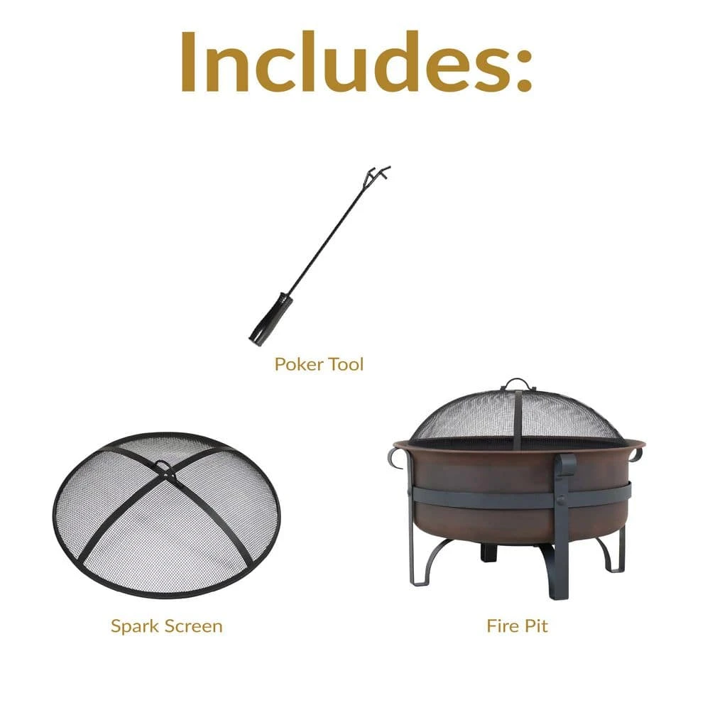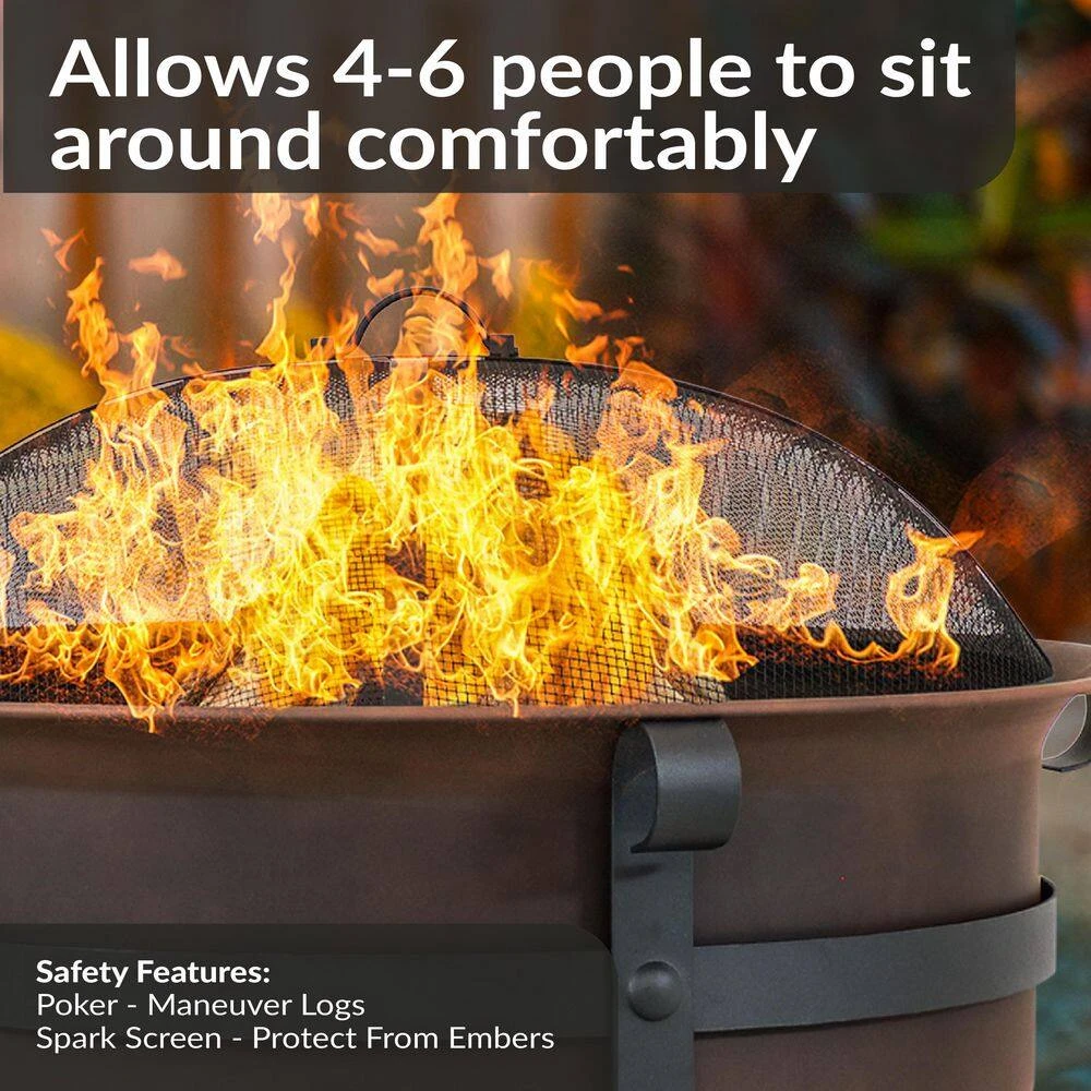 - Fire safety: includes 25.5 in. metal round spark screen for added safety from flying sparks, a drainage hole and 20 in. poker tool to easily control the flame and lift the mesh screen protector, so no worrying about burning hands