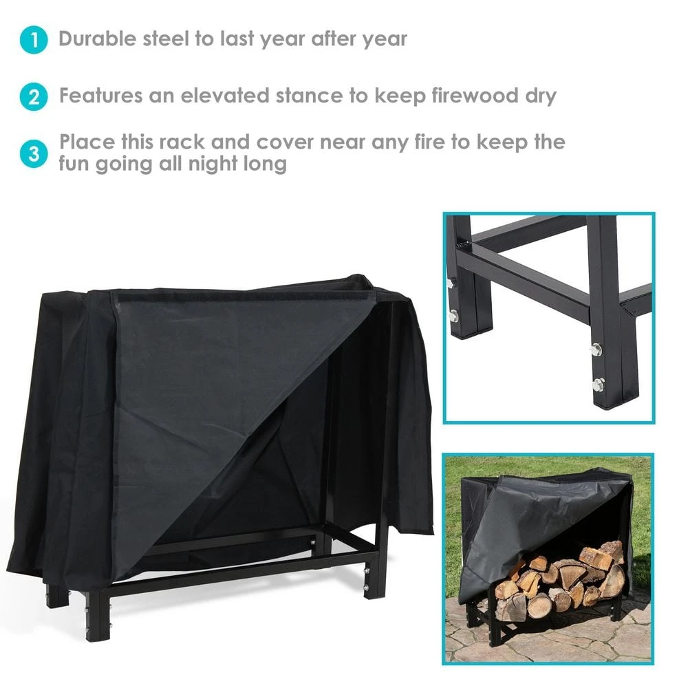This durable black steel indoor/outdoor firewood log rack with PVC cover will help keep firewood handy whenever needed. With a durable steel construction, this is an ideal way to organize and store logs. Slightly elevated to keep firewood dry, this is a must-have accessory for any wood burning needs both indoors by a fireplace or outdoors by a fire pit. Plus, the included cover for the rack ensures that firewood will remain dry and ready to burn at the next fire.