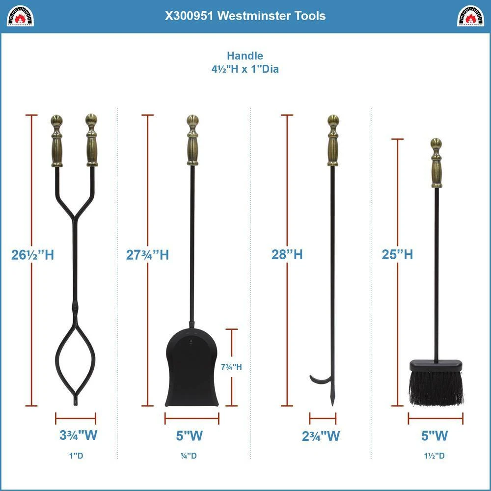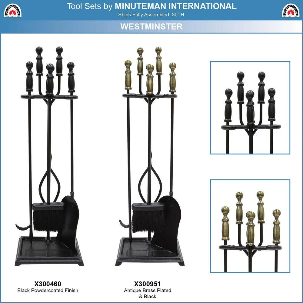 The Westminster Tool Set has a classic ball-end handle design, rectangular base and holds 4 tools – poker, tongs, shovel and natural Tampico fiber brush. Our tool handles and bases are solid, zinc die-cast with solid rods for comfortable weight and good balance. in Polished Brass, Antique Brass or Antique Brass with Black finish. Pair any of these with 1 of our MINUTEMAN INTERNATIONAL Emblem Fireplace Screens with brass accents or Black wrought iron Fireplace Screens to complete your fireplace decor. Add a wool hearth rug and you are ready to spend a cozy evening at the fireside.