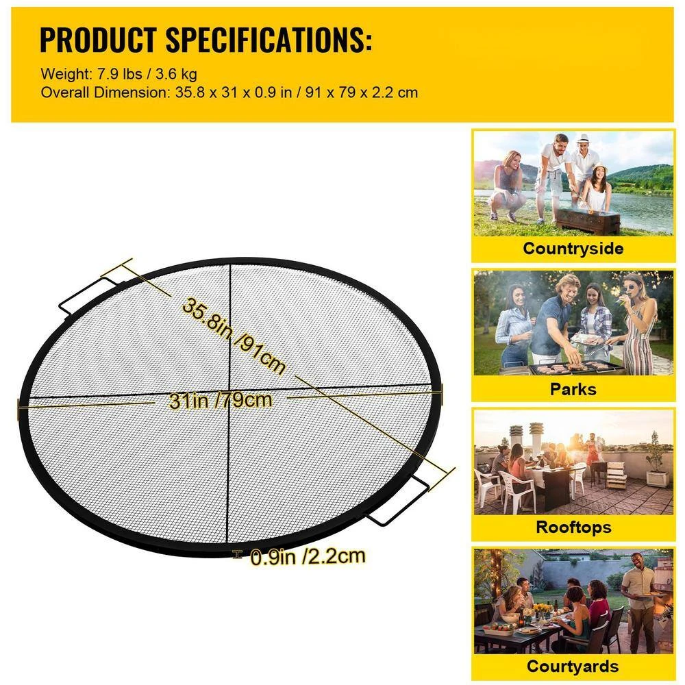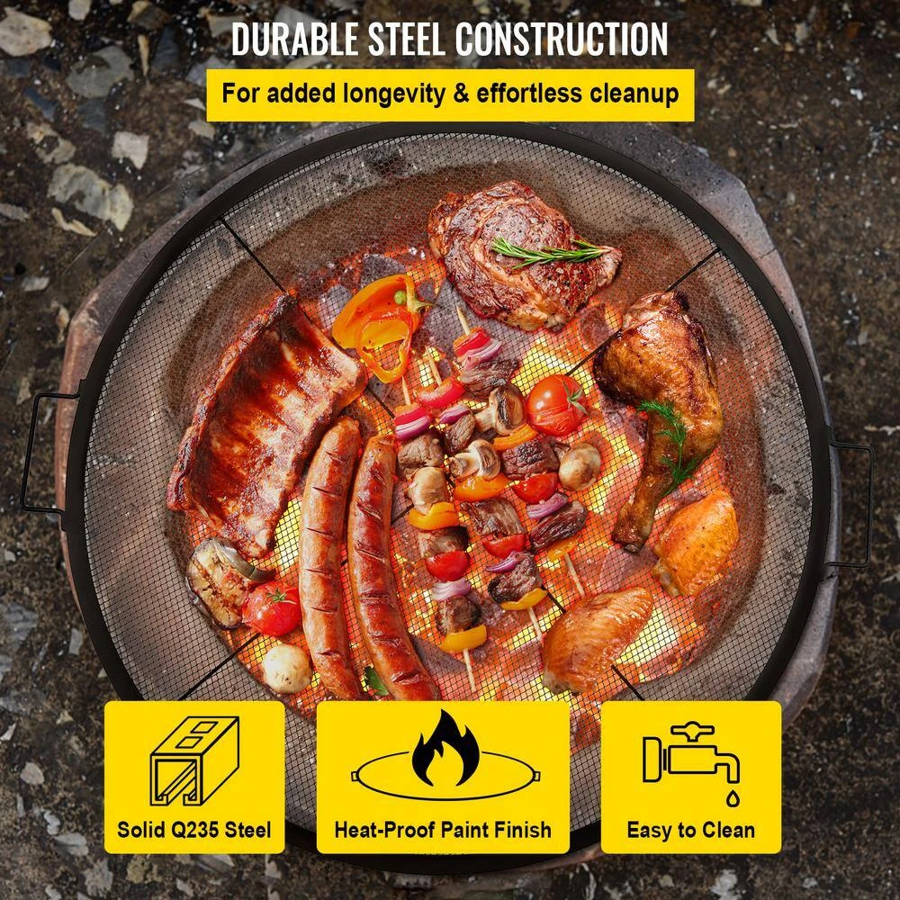 Transform your fire pit into a barbecue grill with this round fire grill grate. The VEVOR cooking grate is made of solid Q235 steel construction with a heat-proof black coating, which will bring you an extraordinary grilling experience. Also, the extra-large cooking area of Φ31 in. is suitable for the whole big family or friends gatherings. and the considerate handles attached to the grate are designed for convenient removal. So enjoy your delicious food with our cooking grate.