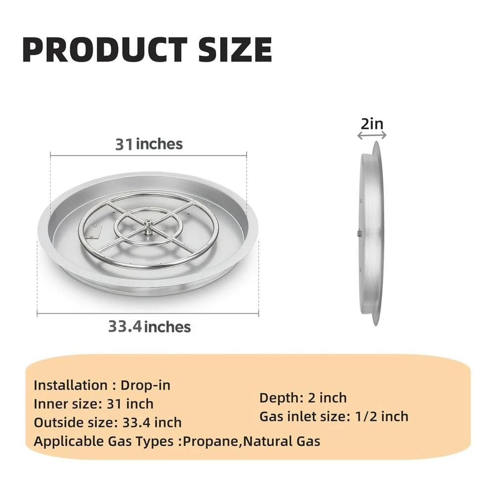 Durable Material – The fire pit burner is crafted from stainless steel, which can withstand high temperatures, resist bending, and is corrosion-resistant. This ensures airtightness while providing enhanced durability and longevity. DIY Your Fire Pit – The drop-in design combined with the burner pan adds a fresh and modern touch to your fire pit. By using this fire pit kit to replace a traditional wood fire pit, you can also eliminate the hassle of smoke and ash. Create a beautiful and inviting fire pit for both indoor and outdoor settings. Quiet and Better – All of our flame holes are precision-drilled rather than punched, allowing for smoother gas flow and creating a better flame. This design ensures there is no whistling noise. Dual Fuel Compatibility – This versatile drop-in fire pit burner kit is compatible with both natural gas and propane, providing flexibility for any setup. An air mixer ensures optimal performance when using propane. Nice Match – Enhance your fire pit by adding decorative fire glass or lava rocks to create a stunning firelight effect. Build a unique gas fireplace insert or propane burner setup to add warmth and elegance to any space.