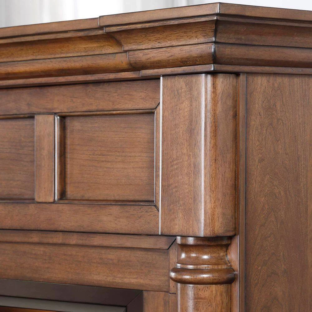 - Luxury Walnut Mantel Design: Features a richly finished walnut mantel with angular veneering, burl inlay, and distressed accents. Adds classic elegance to any room.