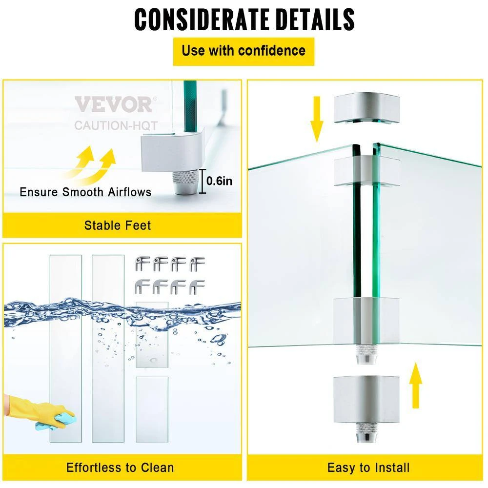 - Package Contents:4 x Glass Boards,8 x Brackets,4 x Foot Pads,16 x Silicone Pads,16 x Screws,1 x Wrench
