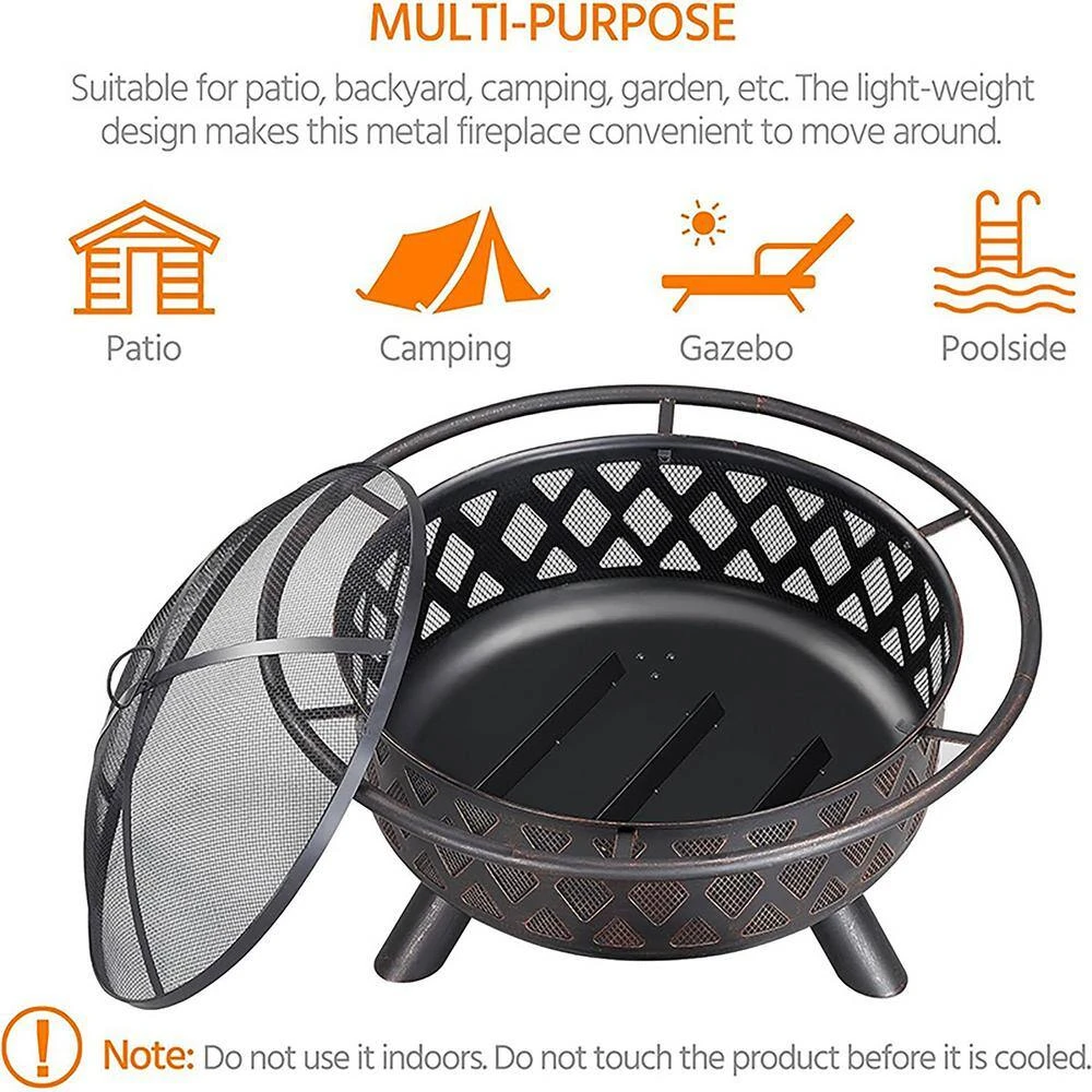 With this metal fire pit, things get warmer and families get happier around it. This round firepit is made from iron with rust-resistant coating. Featuring the crossways pattern and wire mesh wall of the fire pit, this outside fireplace will match any style of houses and gardens. Plus, we have a fire poker, a mesh screen, a rain cover and matching accessories along with the iron firepit for your convenience. It is easy to set them up following the matching accessories and manuals. Bring you much warmth and a cozy atmosphere.