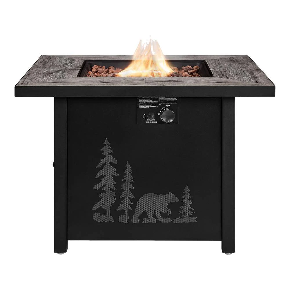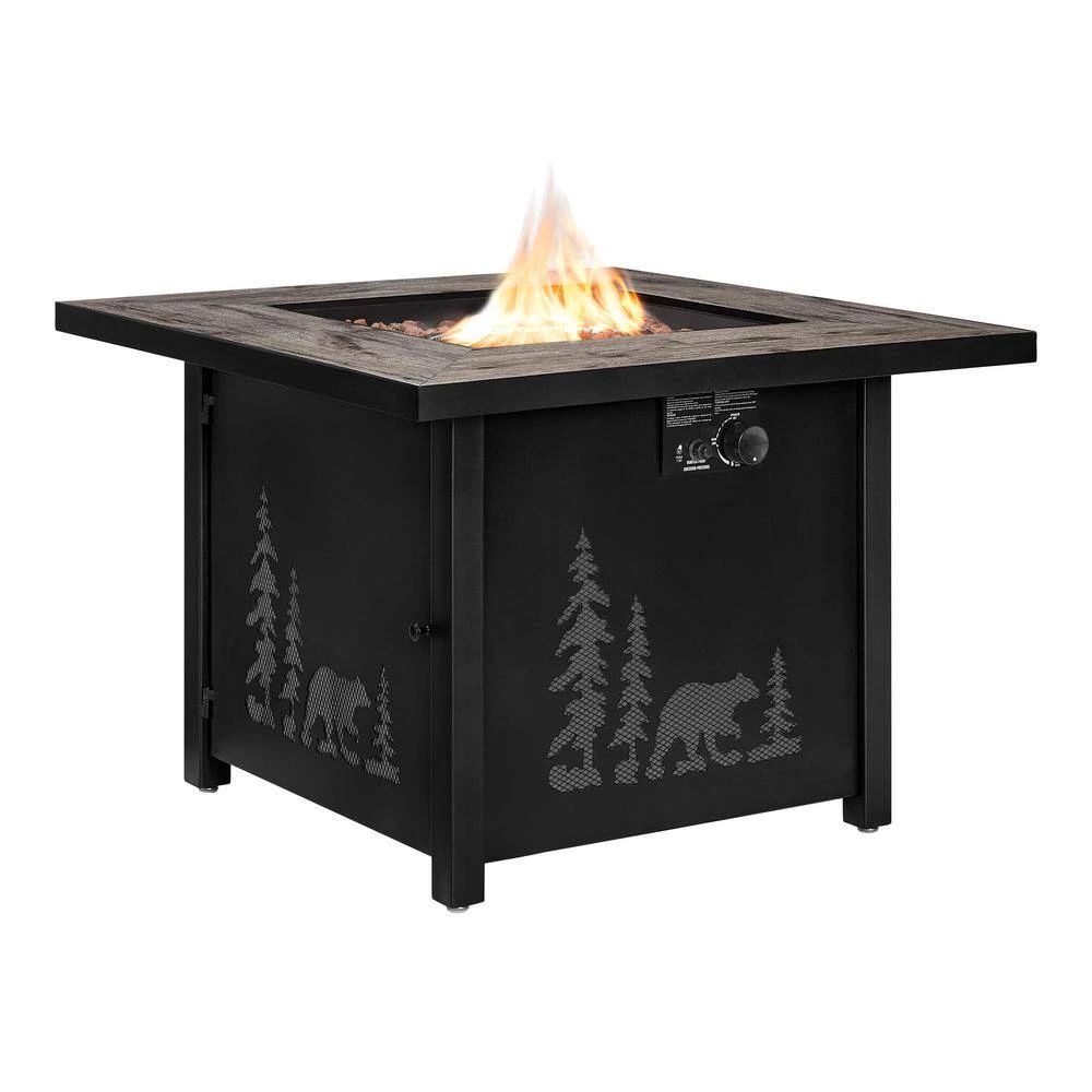 The square propane fire table come with premium porcelain tile tabletop and blends in beautifully with your outdoor seating area, the assembly is easy and the solid steel construction is incredibly durable, a black finish gives it a rustic look that suits outdoor living and can help you to enhance the functionality of your outdoor living space with this fire pit table. A battery-operated pulse ignition gives way to emits up to 50, 000 BTUs of heat output. Bring the warmth and ambiance of a fireplace to your patio, deck or backyard with this LP fire table Plus, the fire table included a access door to allow you change the propane tank easier and a thermocouple flame failure devise to make sure our additional safety.