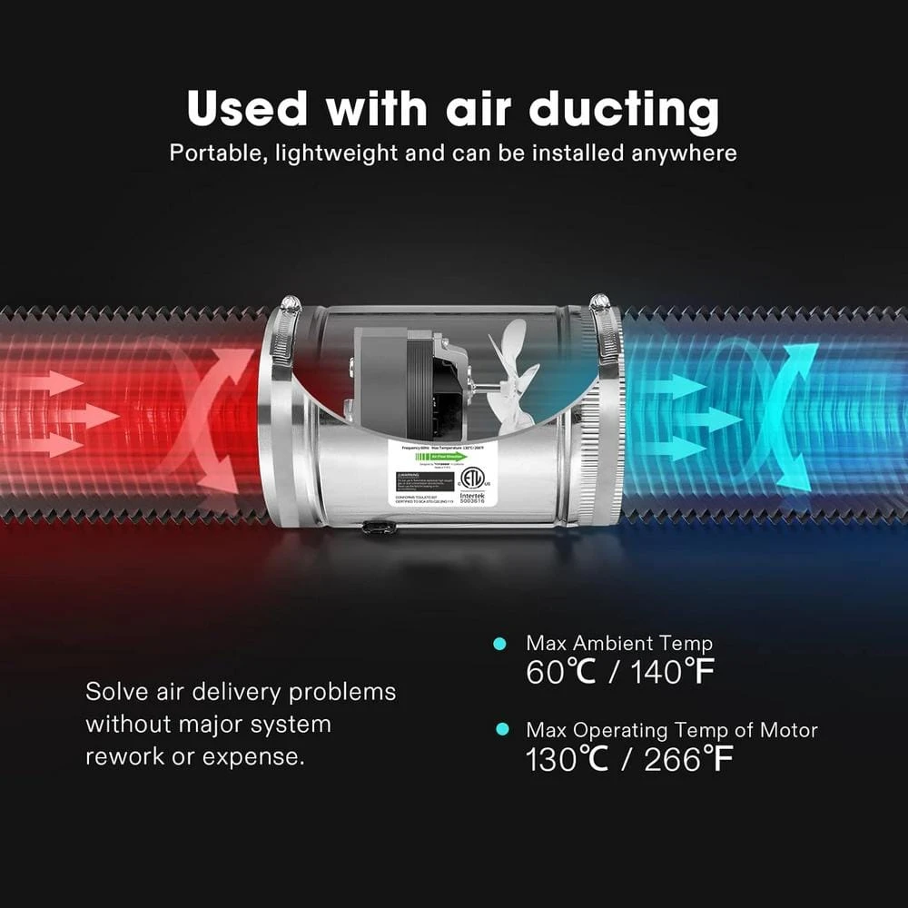 VIVOSUN inline duct fan helps with ventilation issues. This duct booster fan is perfect for boosting airflow in long runs of ducting. Tight, precise construction eliminates rattling and reduces wear and tear to give the element a long life. It is used as intake fan to bring fresh air into grow rooms, also used as exhaust fan in smaller setups with LEDs or Lights under 400-Watt.