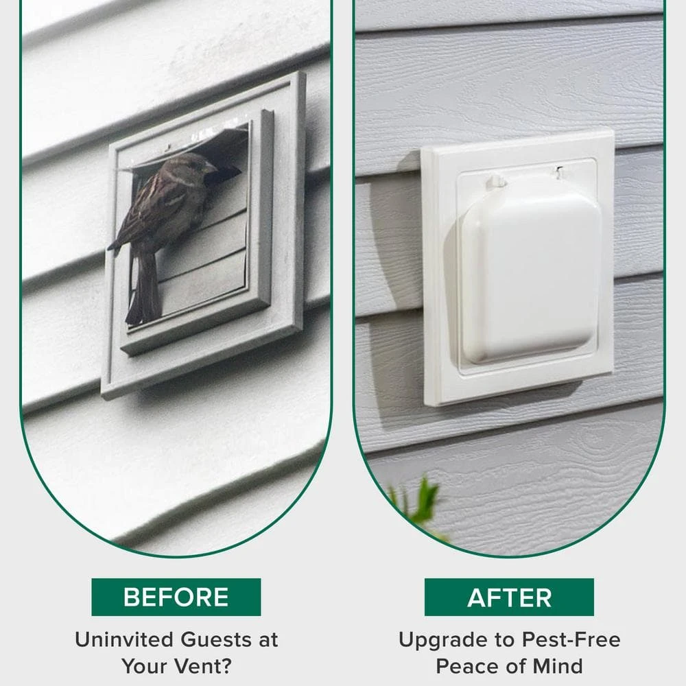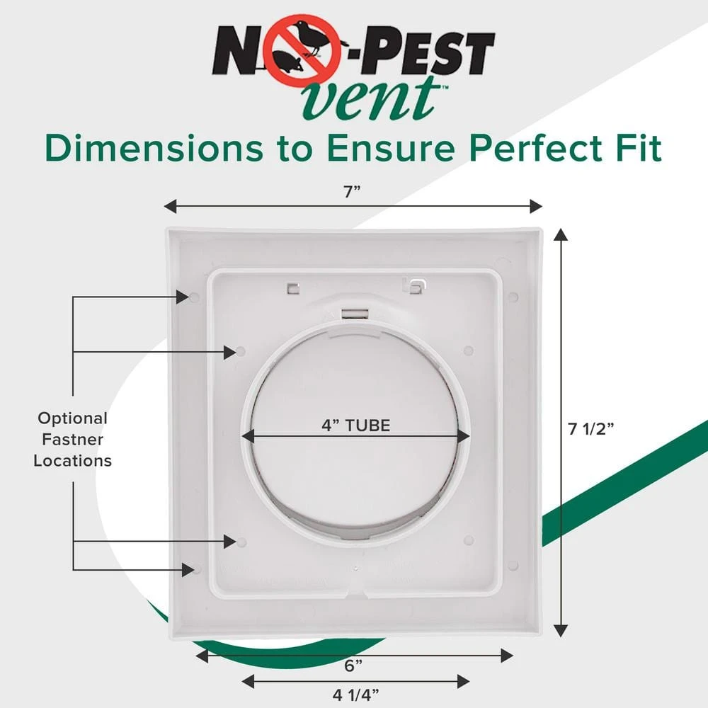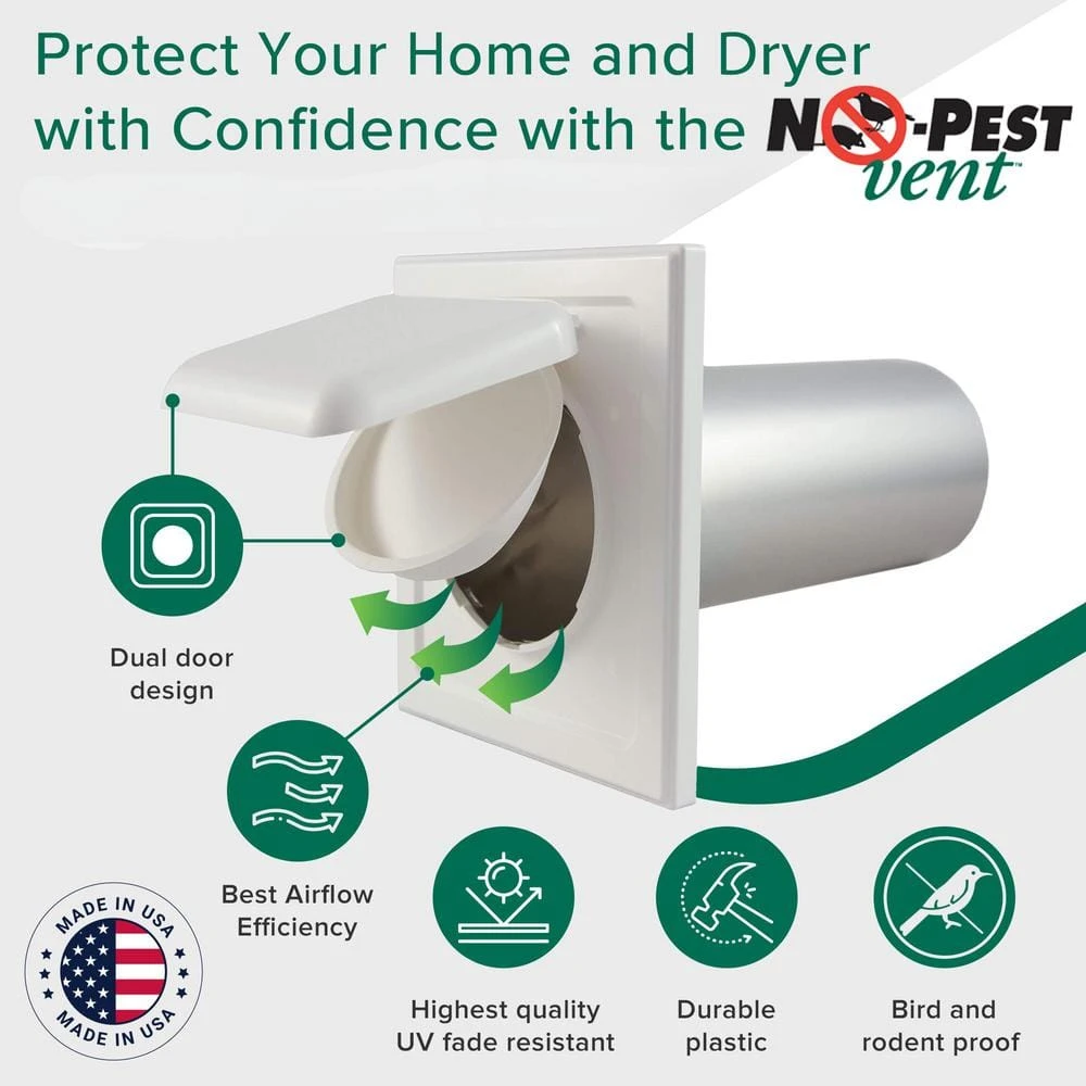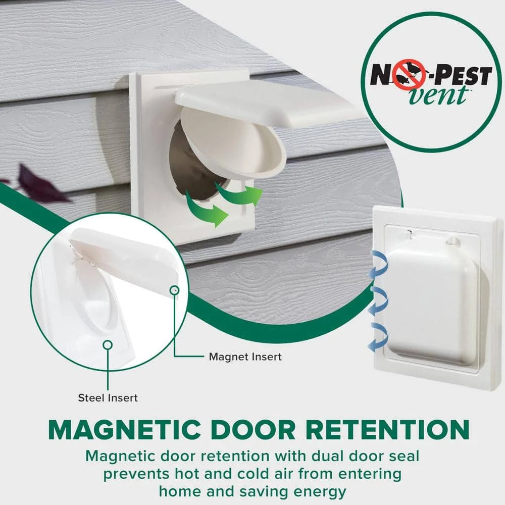 The No-Pest Vent keeps pests out of exhaust vents, saves energy and is practically maintenance free. Its unique, dual door design prevents birds, mice, and other pests from entering the vent. The outer door creates a vortex effect, drawing additional external air during operation to provide more door lift and flush lint away. This is the highest air flow, cleanest operating dryer vent available. The features that make this one of the best dryer vents on the market make it a great option for bathroom exhaust vents as well. Pack of 1-White.