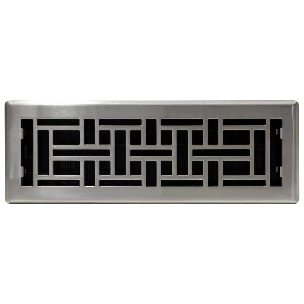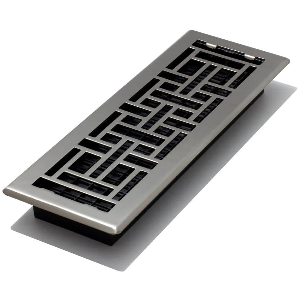 The 4 in. x 14 in. Oriental Design Steel Floor Register is an elegant addition to any home decor. The brushed nickel finish has a lacquered coating for added protection. The damper box is made from a high impact plastic, not metal which can rust and seize up. This is not a cheaper option, it’s the best option. The register fits a 4 in. x 14 in. opening.