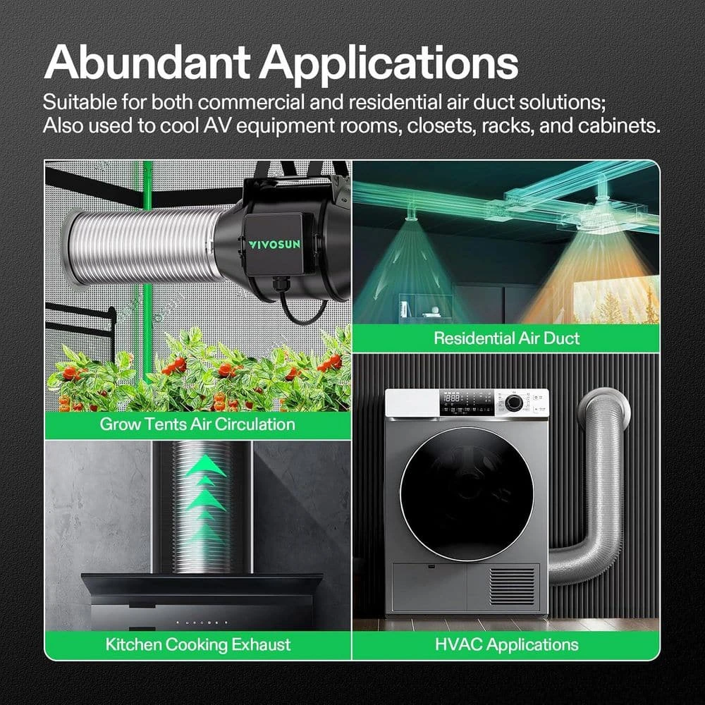 - Widely used in HVAC applications, bathroom venting, stove exhaust, dryer ventilation, kitchen cooking exhaust, planting room, or warmhouse air circulation, etc