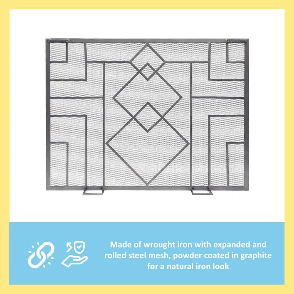 - Dimensions and material: measures 44 in. L x 33.5 in. H x 8 in. D at feet, wrought iron with expanded and rolled steel mesh, powder coated in graphite for a natural iron look