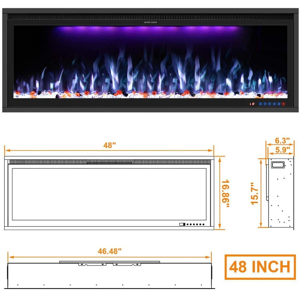 - 2 ways installation: electric fireplace heater is created for recessed and wall mounted installation, 91 in. Insert size: 46.5 in. x 15.75 in. x 5.75 in., overall size: 48 in. x 16.87 in. x 6.31 in. with top front air vent, premium black metallic body with a glass LED display screen and crystals and logs made of resin material create a unique and stylish design