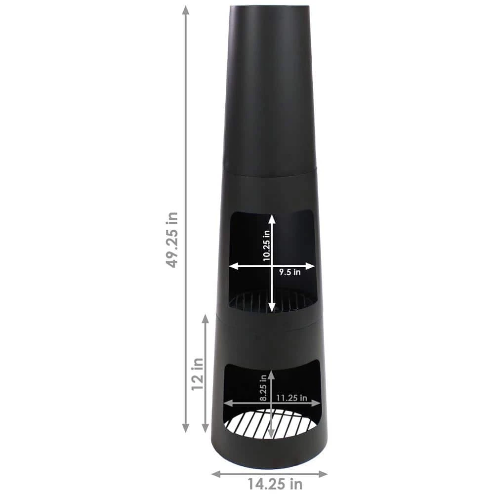 - Great fire pit for patio: 14.25 in. Dia base x 8 in. Dia top x 49.25 in. tall, weights 20.6 lbs. grate for bottom of chiminea is 12.75 in. Dia, grate for upper portion of chiminea is 9.5 in. Dia, ash pan is 11.25 in. Dia, fire poker is 17 in. L, upper portion opening is 9.5 in. W x 10.25 in. tall, bottom portion opening is 11.25 in. W x 8.25 in. tall, 3.5 in. clearance from ground to bottom grate
