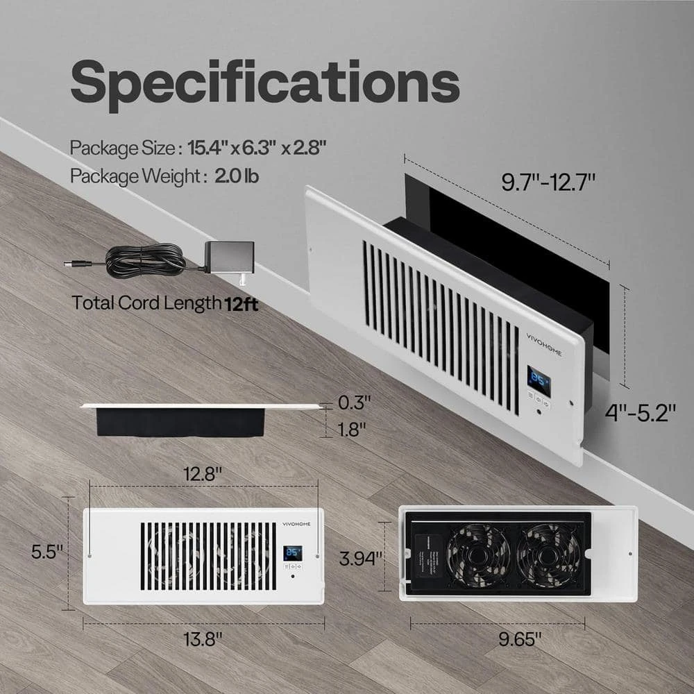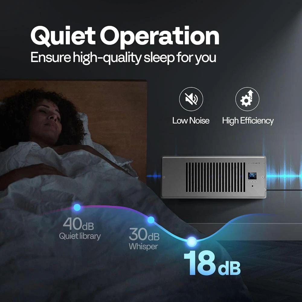 The VIVOHOME Register Booster Fan improves airflow, enhancing temperature and circulation while maximizing heating or cooling efficiency with minimal energy. It fits standard 4in. x 12in. register holes and redistributes air to create a more comfortable indoor climate. The VIVOHOME Register Booster Fan is the perfect addition to your HVAC system, improving airflow and enhancing indoor temperature regulation. The fan runs quietly, producing less than 18 db of noise, providing a peaceful and restful environment for sleeping.